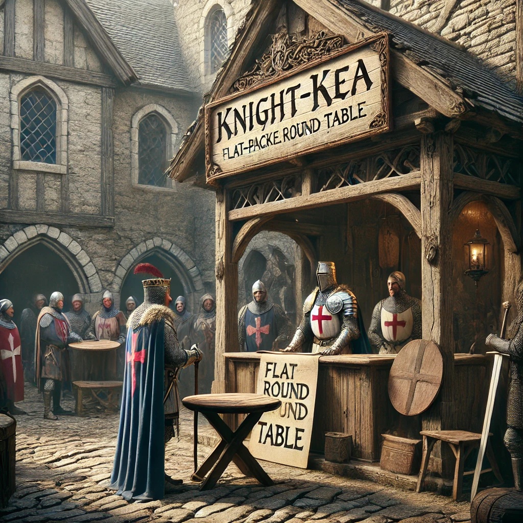 Cinematic, storytelling, spoken conversation, medieval instruments, British accents, satirical