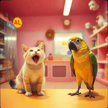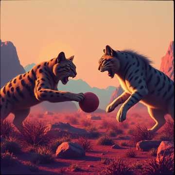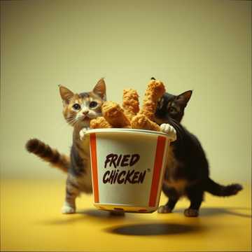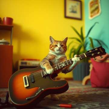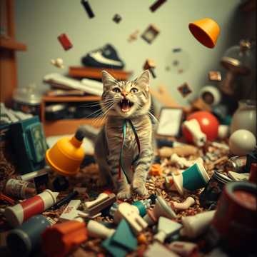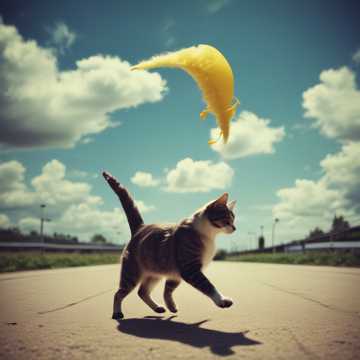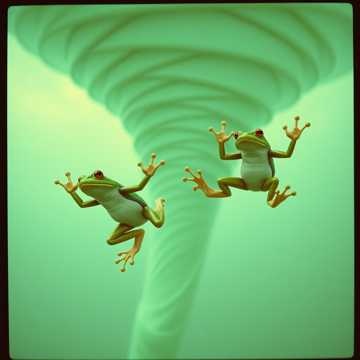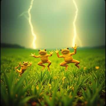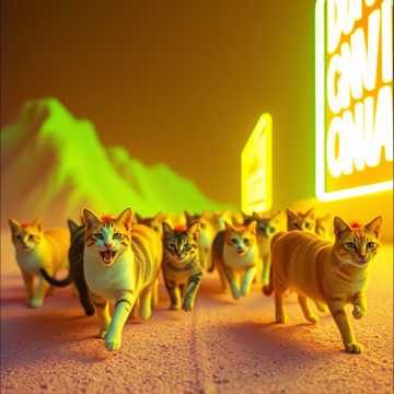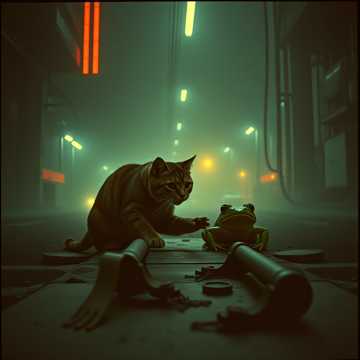Meowing, bass heavy, industrial metal, nu metal, dubstep, a cat running for a frog trying to catch it while chaos wrecks around them, ribbits