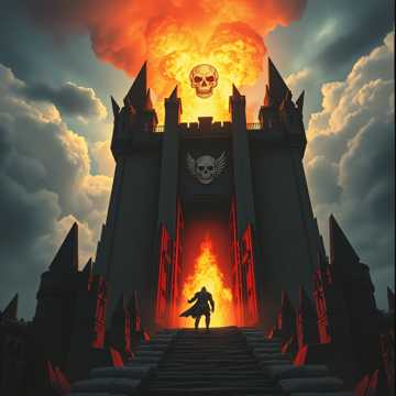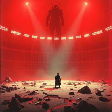 Industrial Metal, Aggrotech, Dark Electro, heavy distorted bass, metallic percussion, aggressive guttural male vocals, brutal, relentless, pounding rhythm, arena battle, overwhelming force, guttural roars, distorted crowd noise, synth sirens