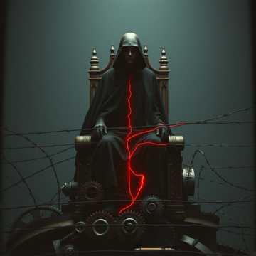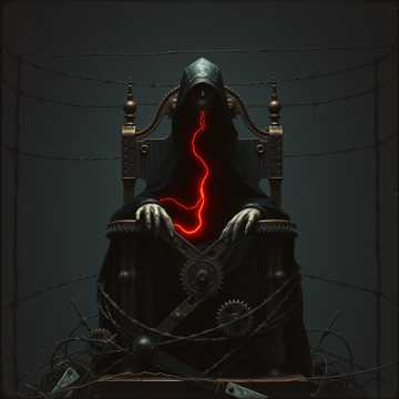 Industrial Metal, Aggrotech, Dark Electro, heavy distorted bass, metallic percussion, aggressive gritty male vocals, menacing, oppressive, tense, rhythmic thumping, paranoid atmosphere, synth drones
