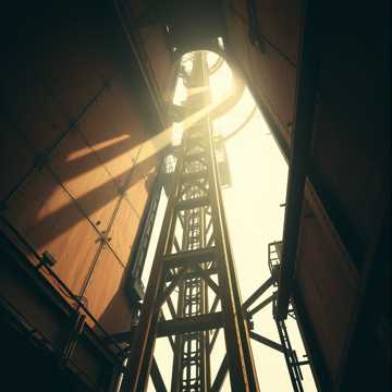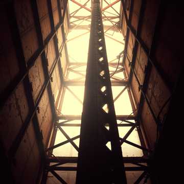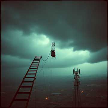 Industrial Metal, Aggrotech, Dark Electro, heavy distorted bass, metallic percussion, aggressive gritty male vocals, intense build-up, vertigo-inducing, high-altitude sounds, wind howling, static radio noise, frantic, desperate, soaring synth leads, metallic clanking, sense of exposure