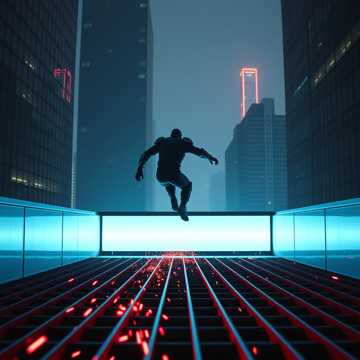 Industrial Metal, Aggrotech, Dark Electro, heavy distorted bass, metallic percussion, aggressive gritty male vocals, frantic, high-energy, relentless, fast tempo, urban chase, dizzying synth arpeggios, whooshing sounds, hard stops, adrenaline pumping