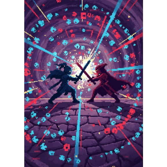 8-bit chiptune, energetic battle theme, square wave lead, triangle bass, pulse wave harmony, tight rhythm, rapid hi-noise snare, looping melody, retro RPG intensity, heroic yet tragic tone, BPM 148, key D minor