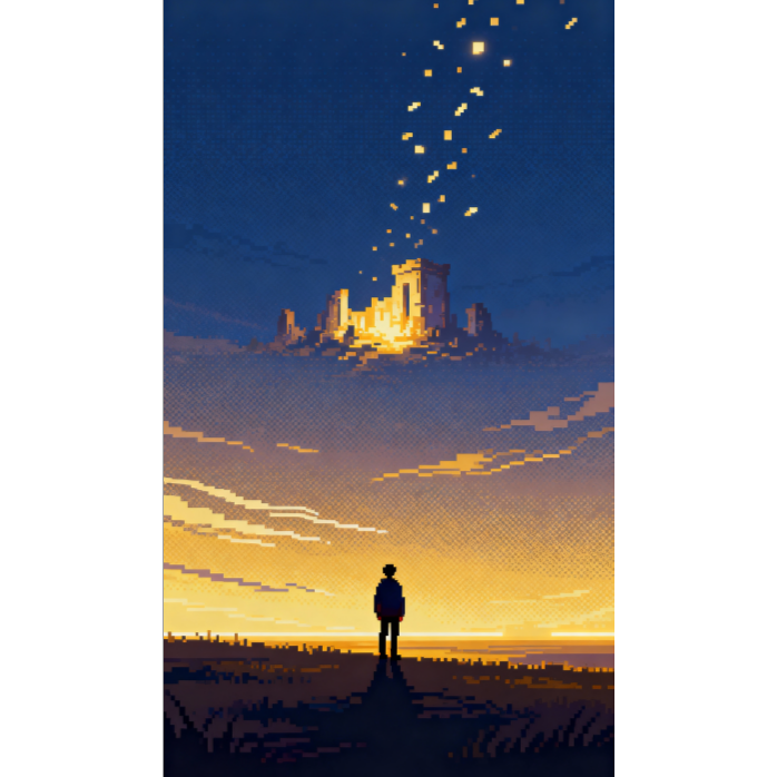 8-bit emotional ambient, slow pulse lead, triangle bass drone, soft white noise texture, reflective and solemn, motif reprise, quiet prelude, minimal rhythm, nostalgic melancholy, BPM 65, key E minor