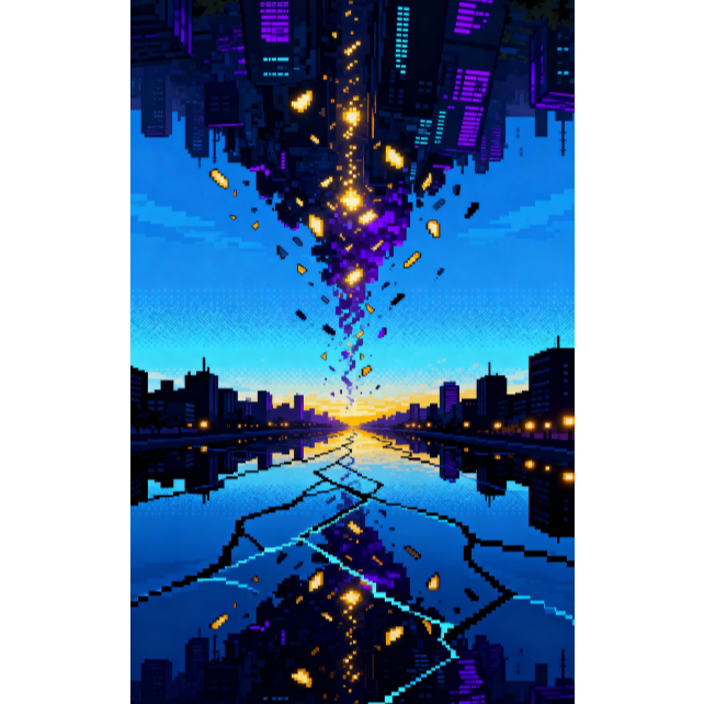 8-bit experimental chiptune, glitch inversion, reversed pulse melody, phase-shift rhythm, detuned harmony, dark ambient intro, dissonant beauty, dramatic transformation, data collapse effect, BPM 95, key G minor