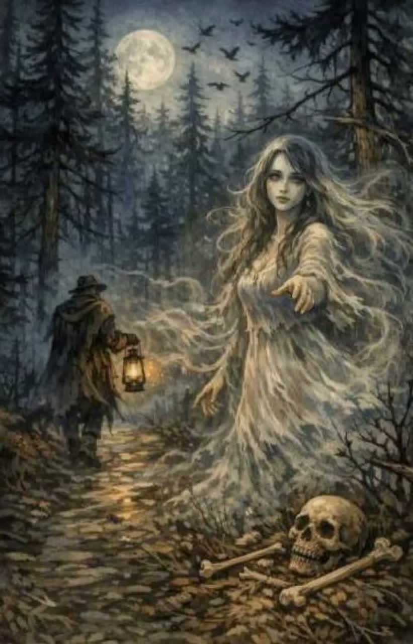 Opening with eerie spoon clatter and night forest ambience, the slow blues groove emerges from deep kick drum, war drums, and hand percussion layers, Dulcimer, twangy banjo, mandolin, and slide guitar thread through the mix, while fiddle and jew harp add witchy accents, Ethereal female vocaloid melodies alternate with soulful human vocals over gloomy, dark fantasy harmonies, Subtle dubstep and house textures infuse the stomping, pagan folk foundation, building to ritualistic choruses—rich voice layers and a powerful, deep-flowing energy sweep through, conjuring a cinematic, haunting soundscape