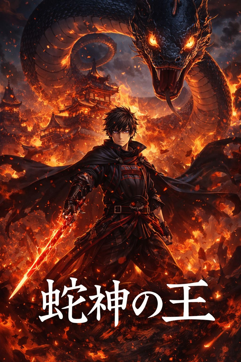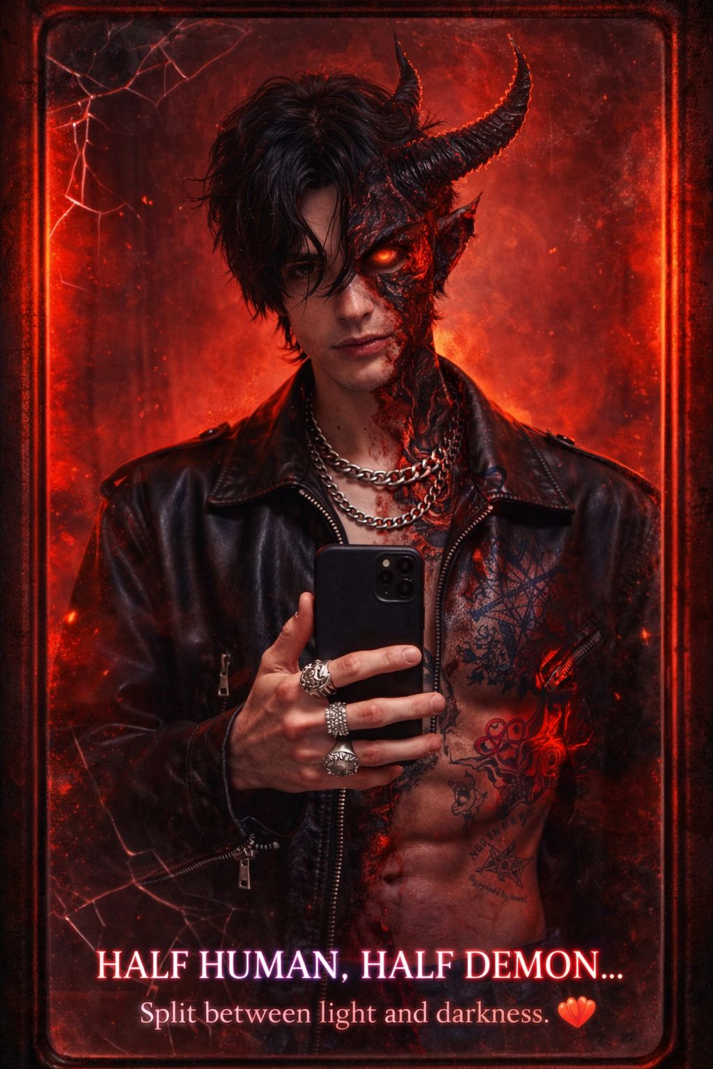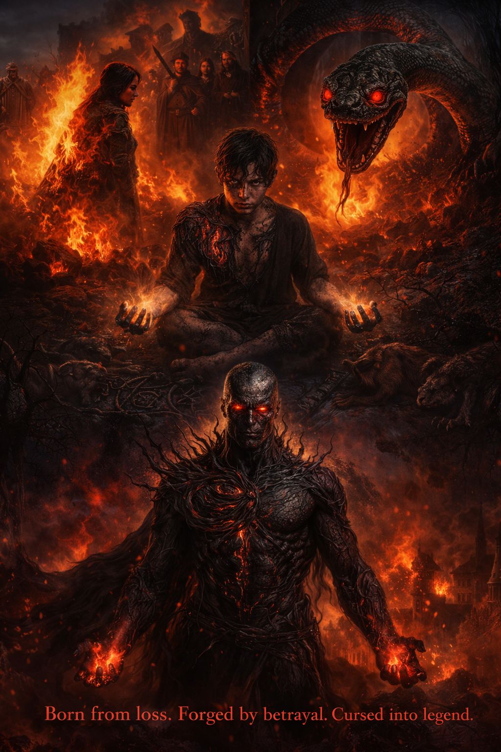 Dark cinematic fantasy, mythological horror, tragic origin arc, epic poster-core, infernal realism
