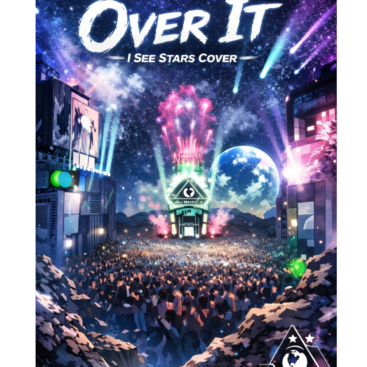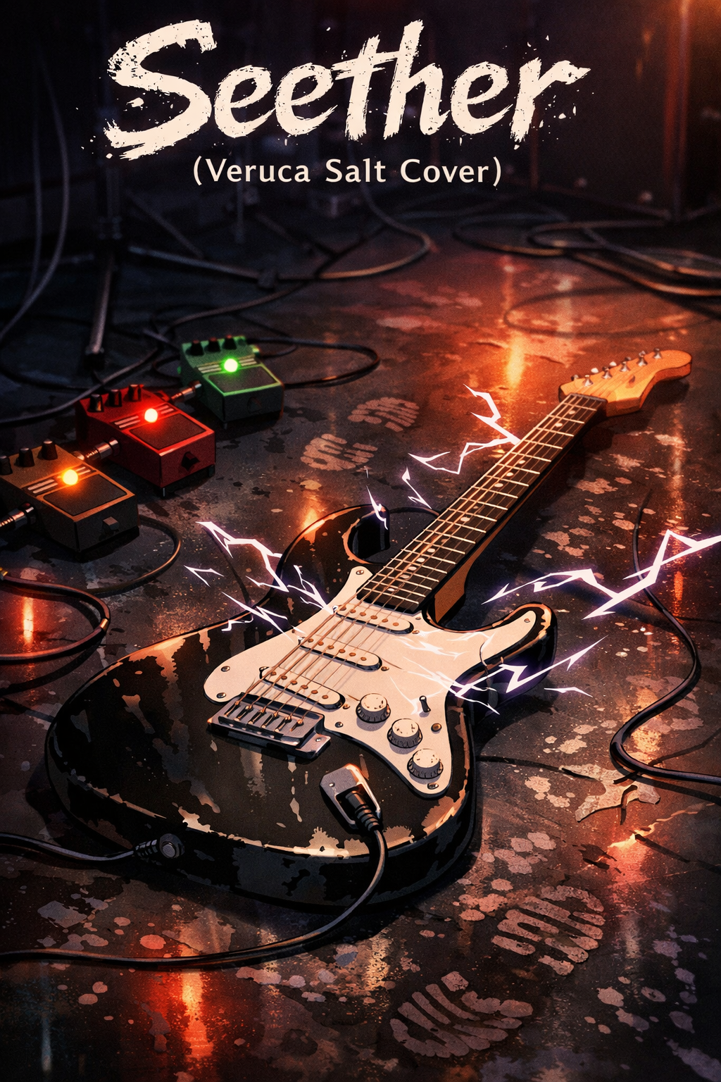 Raw 90s-influenced grunge attitude blended with heavy modern electronic production, Dirty, overdriven guitars and fuzzy bass underneath aggressive synth layers, Drums feel live and reckless but reinforced with electronic hits and glitchy percussion, Vocals are emotional, sometimes strained, with moments of whispered intimacy layered against distorted doubles, Use static noise, feedback swells, and filtered scream-like synths, Choruses hit hard and saturated, verses can drop into moody electronic pulse, Overall vibe: chaotic, cathartic, digital storm meets basement show β ruined mascara energy with glitch effects and low-end rumble