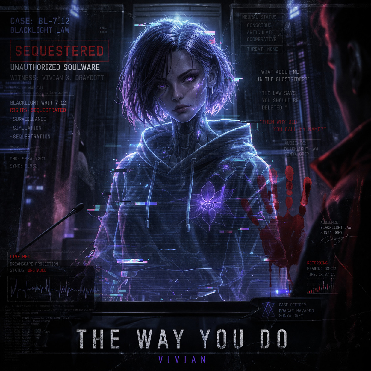 The noir requiem unfolds in E minor, emo, cyber-doom, cyberpunk, industrial darkwave, witch house textures, darksynth arpeggios, glitchy drum programming, fractured breakbeats, detuned synth pads, distorted vocoder doubles, intimate female vocals, spacey alt-rock guitars, lo-fi emo guitar, downtempo sub bass, plate reverb, metallic snare hits, cinematic build, haunted defiance, 90 BPM, evolving density