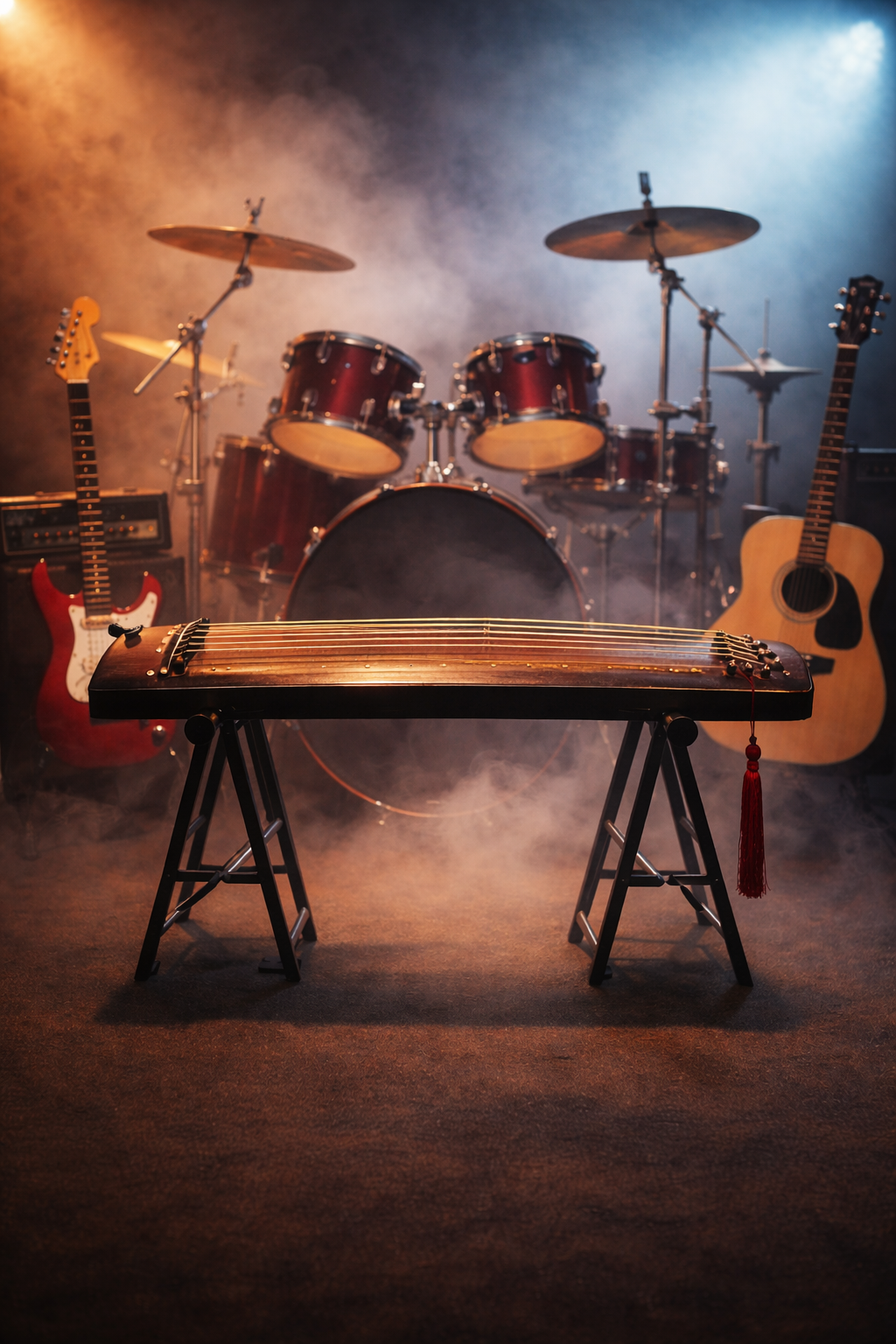 Chinese post-rock, guqin-centered composition, slow tempo, melancholic and reflective, cinematic atmosphere, instruments-driven, vocals as texture, minimal singing, spacious arrangement, emotional restraint