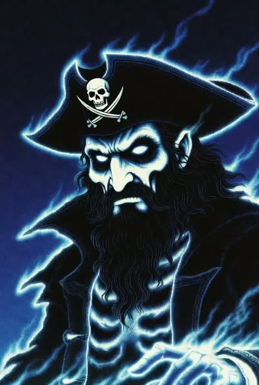 Instrumentation: booming pipe organ, distorted electric guitar with growling bends, upright bass with mwah and glissandi, stormy orchestral brass, eerie choir whispers, Rhythmic drive: sea-shanty swing fused with heavy metal march, syncopated percussion like chains and cannon fire, Atmosphere: gothic Caribbean horror, voodoo influences, thunderous yet playful, dripping with supernatural dread and comic swagger, Emotional arc: ominous and grand at the start, swelling into chaotic pirate revelry, then collapsing into eerie silence with ghostly echoes, Production notes: cinematic reverb, subtle tape warble, layered harmonics for spectral texture, bass growl emphasized for vocal-like menace