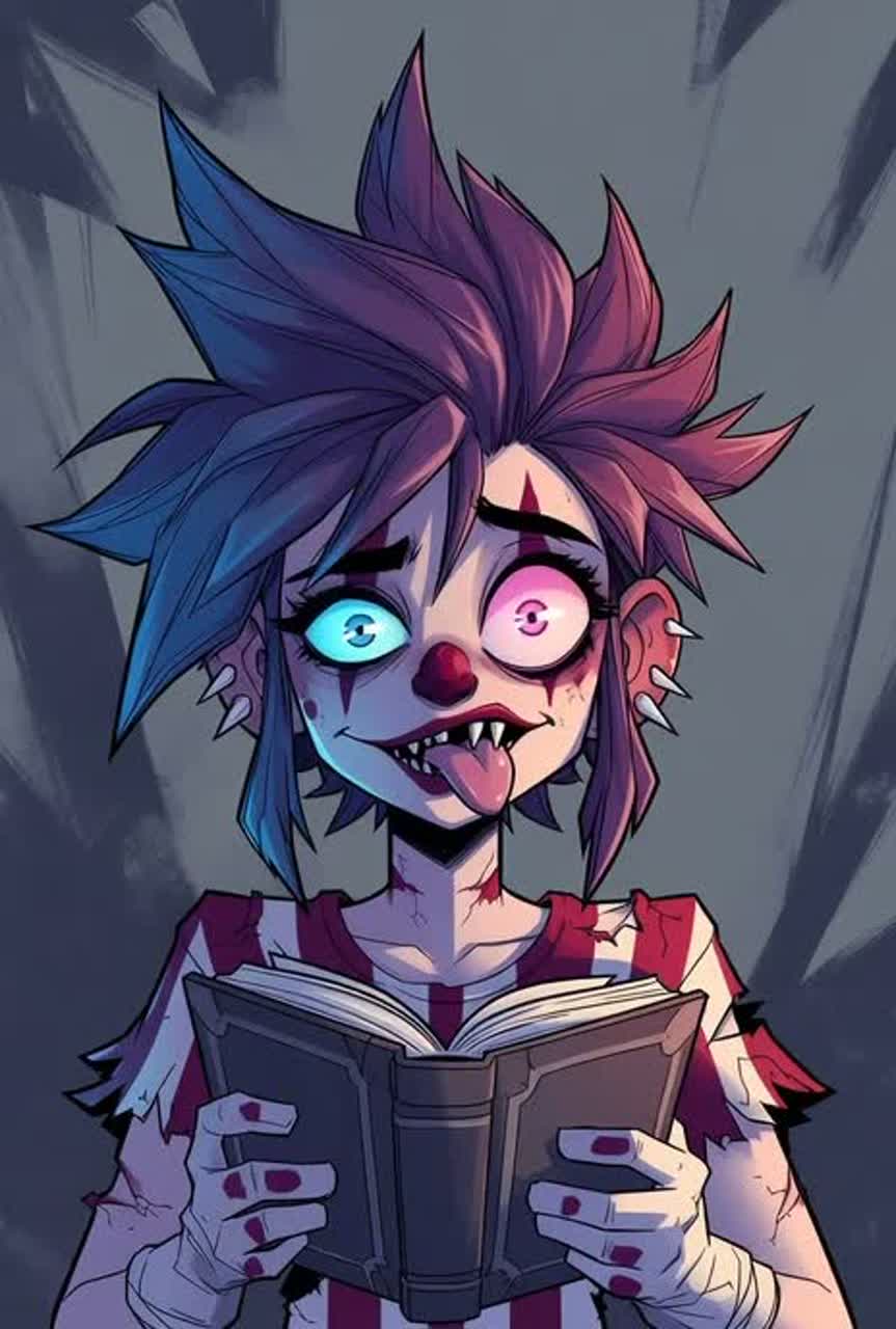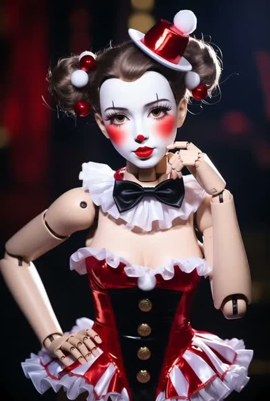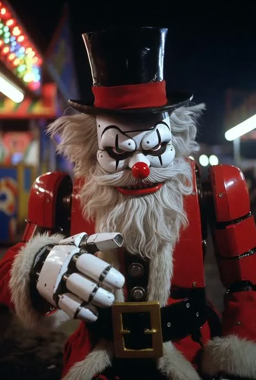 A dark carnival soundscape blending sinister jazz and brutal metal, Growling distorted bass with mwah and vocal-like bends, frantic upright bass pizzicato, and eerie glissandi, Screaming electric guitars with circus-like chromatic runs, blast beats colliding with swing rhythms, Discordant brass stabs, muted trumpet growls, and saxophone shrieks weaving through ominous calliope organ, Chaotic yet theatrical, evoking a demonic circus parade at midnight, Atmosphere: grotesque, manic, theatrical, evil yet playful