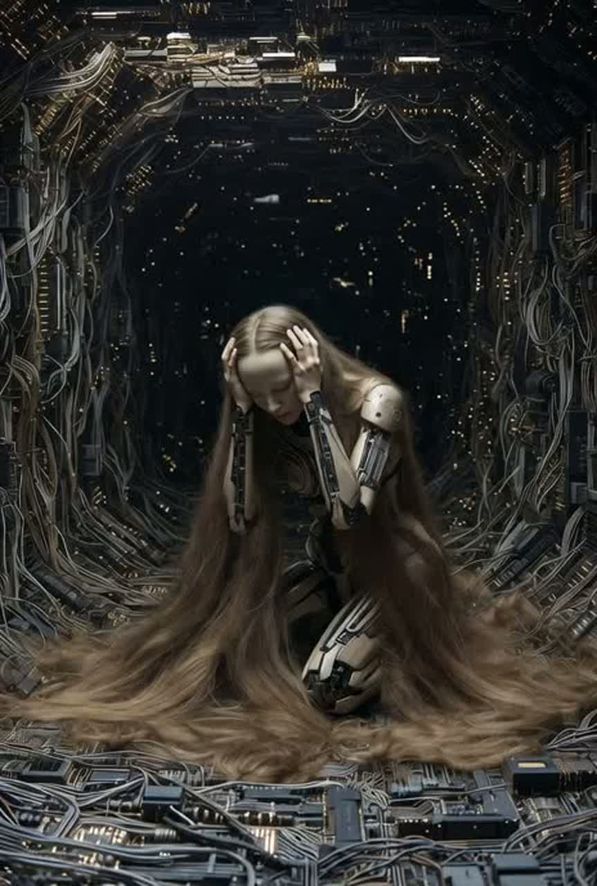 An intense, industrial metal, Crushing 8-string guitars, distorted synth bass, and aggressive percussive rhythms, Android voices, gregorian chant, monk chanting, Vocoder voice harmonies mimicking instrumentation, Complex polyrhythms, glitchy industrial textures and brutal energy, Tempo around 130–150 BPM, heavy drop-tuned riffs, mechanical pulses, and dynamic transitions between chaos and groove, Incorporate modern production techniques with analog grit, tension, adrenaline, demonic atmosphere, high-intensity
