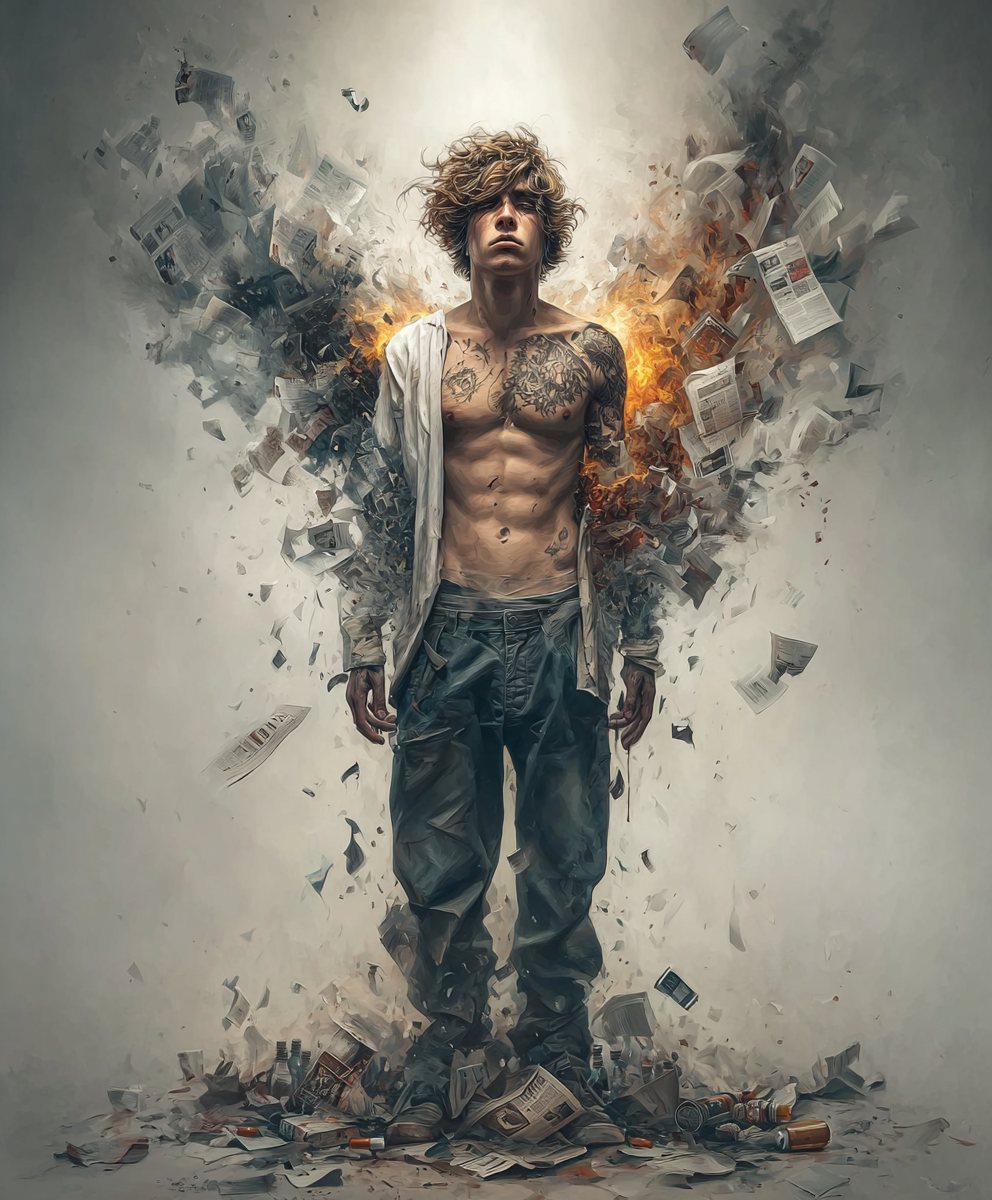 A high-quality, emotionally immersive, energetic avant-garde track that fuses Alt pop, 90s jangle pop, post-grunge, punk rock, folk rock, alt rock, ambient, and jangle pop with subtle pop elements for a memorable hook, The song showcases dynamic rhythm guitar, creative riffs, and a unique groove anchoring a structure that unfolds with tension and release, A deep bass intro sets the tone, evolving into a groovy, punchy bassline, supported by crisp, driving drums, Distorted electric guitars add grit and sonic contrast, and ambient textures to build a dark, energetic and melancholic atmosphere, The instrumentation feels alive and dynamic, It begins in a conversational free-flow, Vocals are baritone, gritty, slight rasp, soulful, and emotional restrained and ambient in the verses, soaring and powerful in the choruses, Backup vocals provide harmonies and punk style shouts, Song is around 4:25-5:00 mins