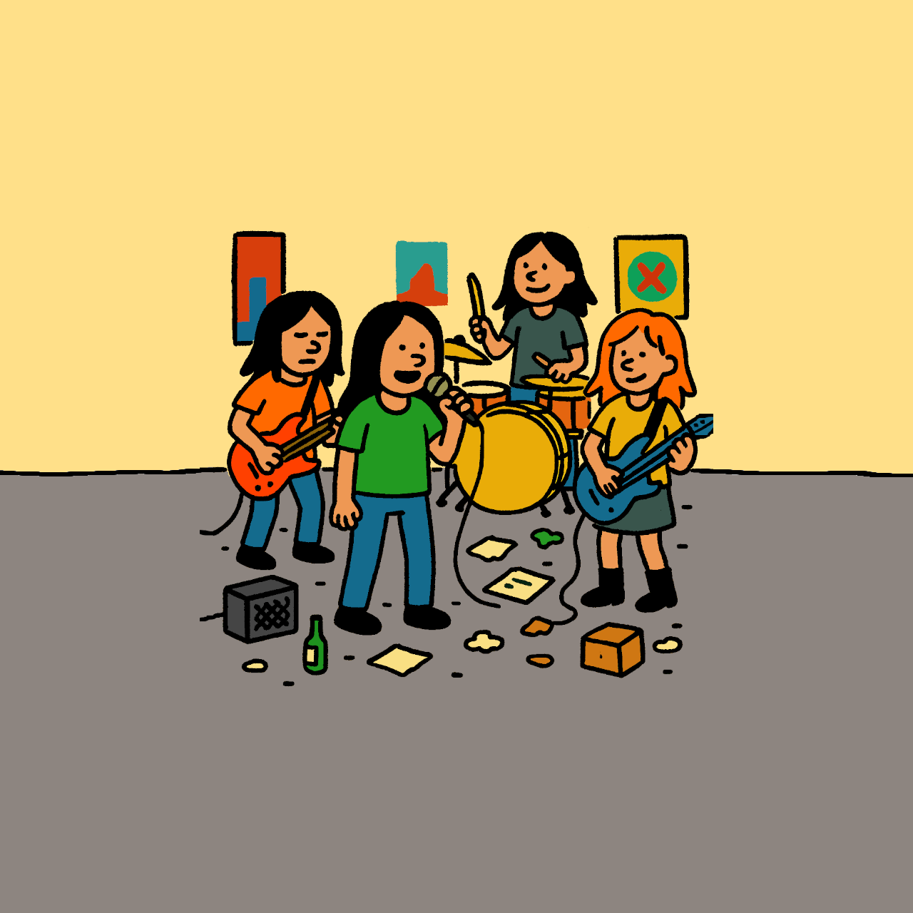 spoken intro, Song opens with a clean acoustic guitar intro, small basement rehearsal, offkey, misplayed chords and notes