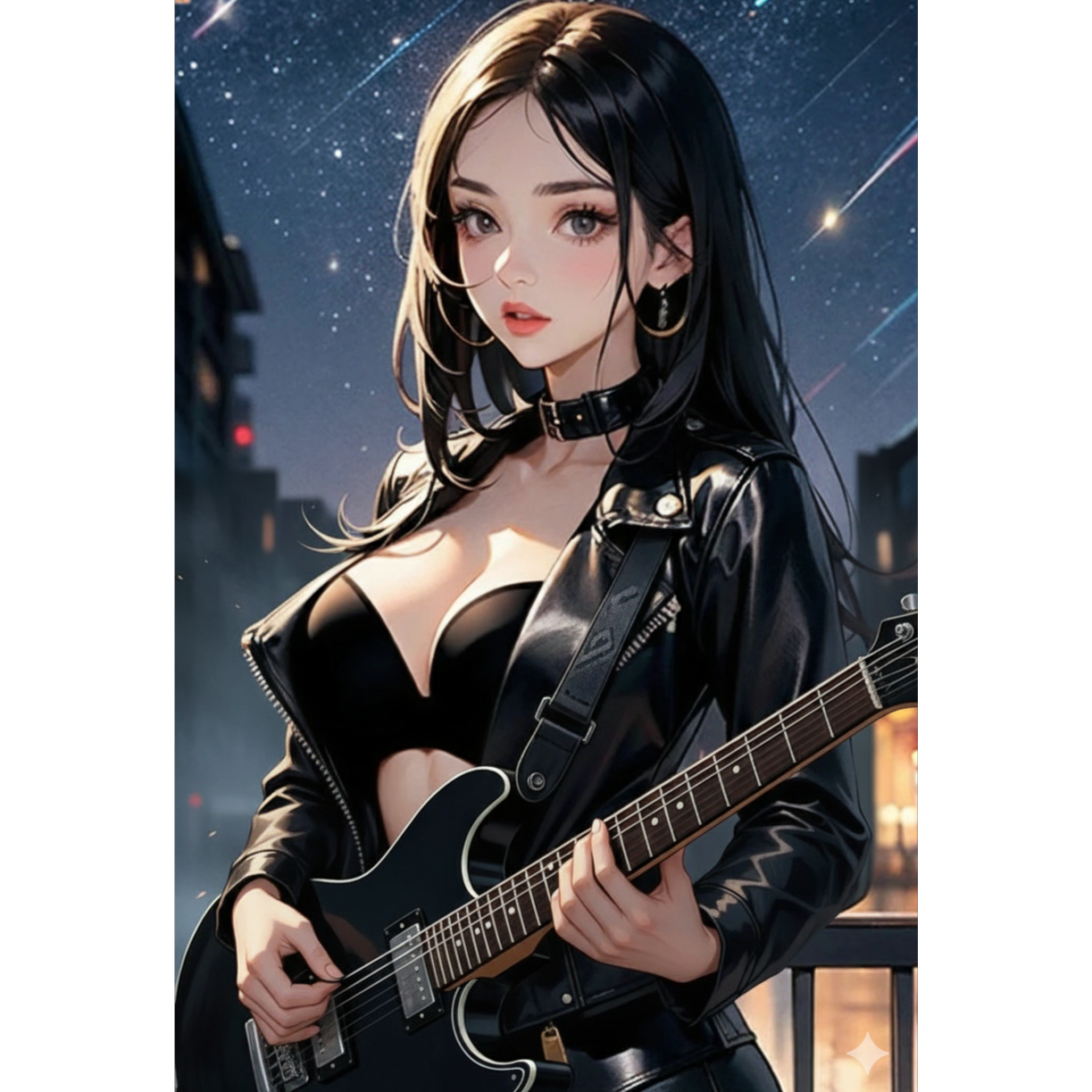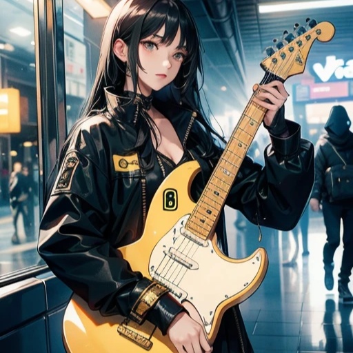 Industrial rock, hibryd score, trap, metal fusion, virtuoso electric guitar solo, high female vocals, whispering vocals, epic choirs, heavy distortion, raspy female vocals, menacing and agressive melody, choirs, 80s disco influences, futurist techno ambient