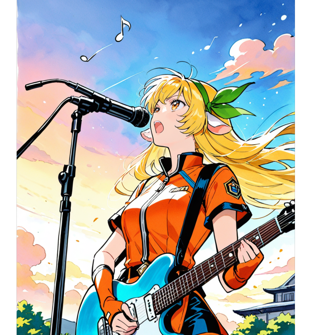 High-Speed Hard Rock in G Major, BPM150, 4/4 Time Signature, Bright distorted electric guitars, fast riffs, driving basslines, and aggressive drums with heavy kick and snare, Three energetic female vocalists alternate lead and backing parts, with unison and call-and-response, Vocal tone is cheerful, powerful, and youthful, Catchy and chantable choruses full of excitement, Verses feature fast lyrical phrasing with strong rhythm, Intro starts with short explosive guitar riff, Bridge includes energetic guitar solo and shouted lines, Final chorus sung by all in strong harmony, Extended outro with group chant, claps, and crowd cheer, Arrangement is loud, dynamic, and uplifting with no synth or pads, Live stage atmosphere, ideal for animation or performance simulation, Focus on rock energy, speed, and joy, celebrating youth and delicious moments in a musical feast