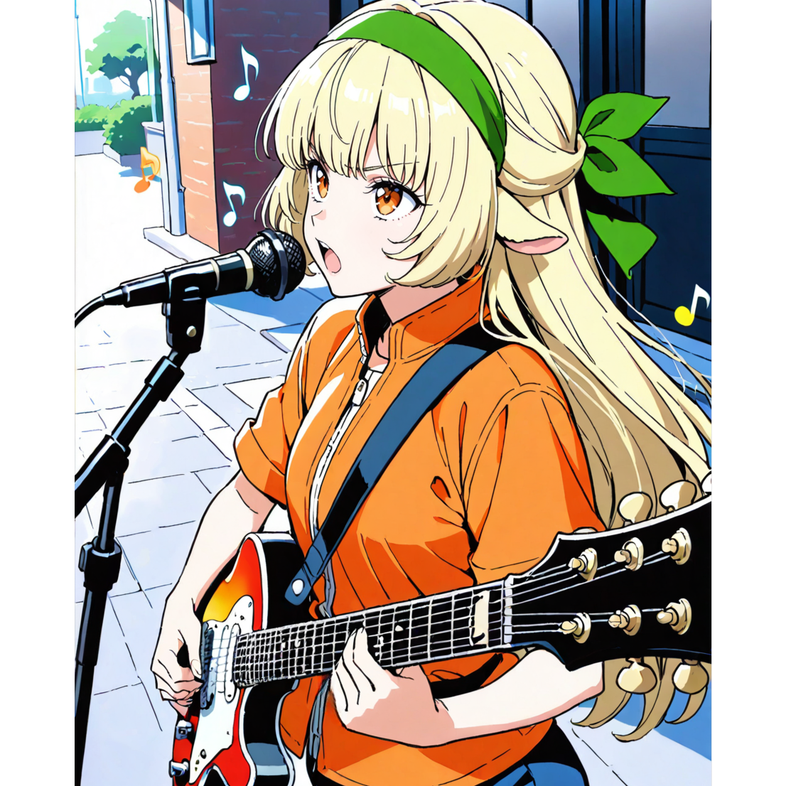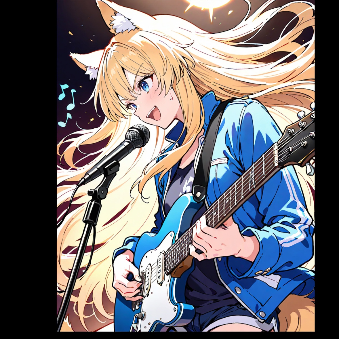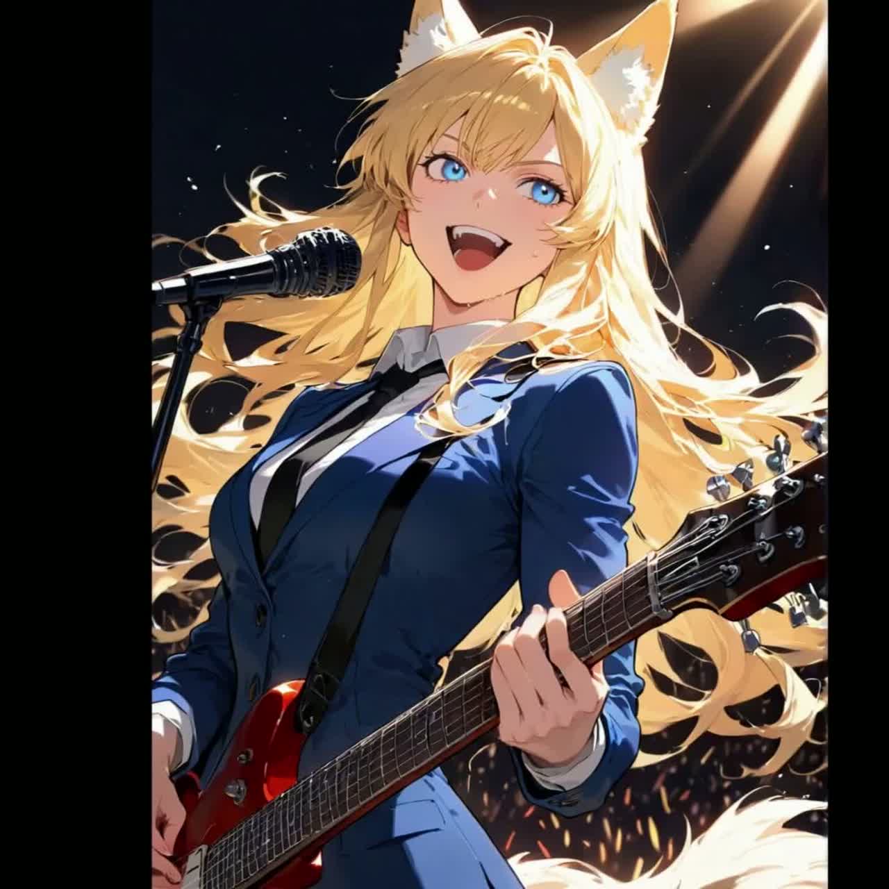 Electric guitar lead, heroic anime opening, orchestral rock, Key C major, 4/4, 160 BPM, Bright, triumphant, energetic, Driving drums with punchy snare, tom builds and cymbal crashes; power‑chord rhythm guitars; brass fanfares; staccato strings; choir “oh” pads; tight bass; subtle synth arps, Verse lighter with palm‑mutes; pre‑chorus rising strings and tom rolls; chorus explodes with full band and unison hooks, Short stop‑hit before each shout, Bridge half‑time break then guitar solo; final double chorus with octave lead, bigger choir and wide cymbal swells, Modern wide mix, clean‑to‑crunch guitar tone, limiter‑ready