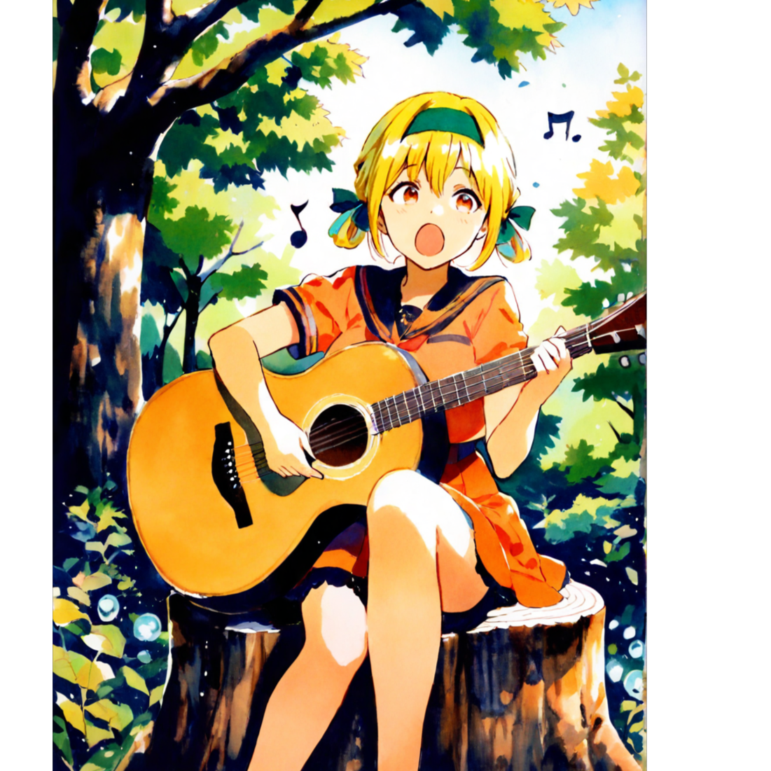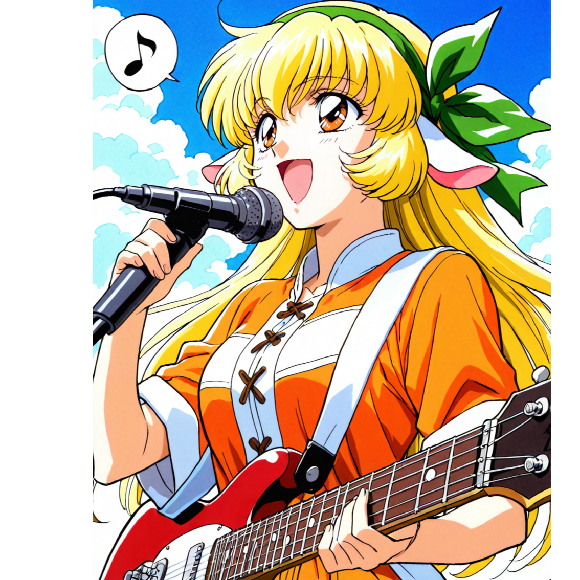 High-Speed Hard Rock in G Major, BPM180, 4/4 Time Signature, Bright distorted electric guitars, fast riffs, driving basslines, and aggressive drums with heavy kick and snare, Three energetic female vocalists alternate lead and backing parts, with unison and call-and-response, Vocal tone is cheerful, powerful, and youthful, Catchy and chantable choruses full of excitement, Verses feature fast lyrical phrasing with strong rhythm, Intro starts with short explosive guitar riff, Bridge includes energetic guitar solo and shouted lines, Final chorus sung by all in strong harmony, Extended outro with group chant, claps, and crowd cheer, Arrangement is loud, dynamic, and uplifting with no synth or pads, Live stage atmosphere, ideal for animation or performance simulation, Focus on rock energy, speed, and joy, celebrating youth and delicious moments in a musical feast