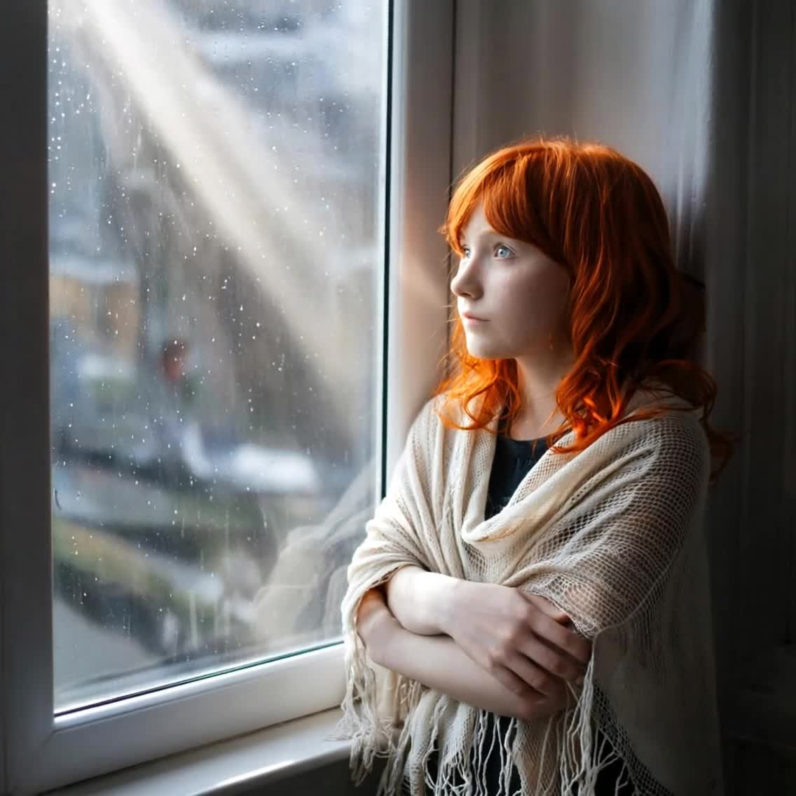 "Melancholic female vocal, dreamy indie folk, Soft guitar/piano, summer rain atmosphere, Lyrics about love, longing & sunlight, Slow tempo, emotional delivery, intimate vibe, 65BPM"