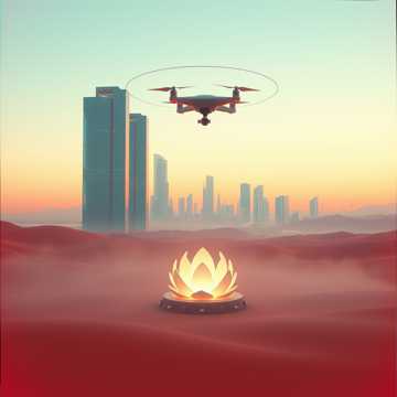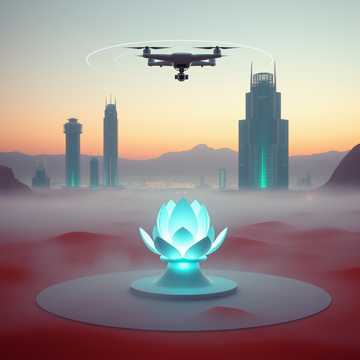 low fantasy, futuristic, 80s, ambient, Drone footage accompanying the entire musical track, sometimes with fast yet systematic and synchronized flybys, Throughout the track, there's a beautiful register of a female voice, a female accompaniment with graceful vocal transitions, The track is dreamy, the melody carries you to the heights, somber, wasteland, progress, synth, largo, weather six, peaceful, hopeful, soft ending