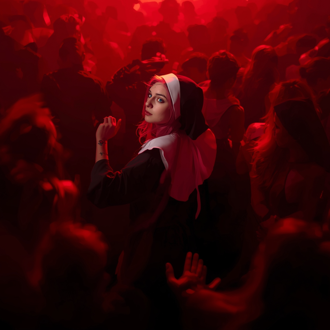 At 115 BPM, this dark techno track features punchy big room drum kits with massive kicks and crisp percussion, Funky basslines with experimental textures create complex rhythmic patterns, Dramatic synth melodies soar through the mix with theatrical intensity, Dub techno elements provide deep, spacious atmosphere in the background with reverb-soaked chords and delays, Powerful, theatrical, and sensual male vocals deliver dynamic variations throughout - from whispered intimacy to commanding presence, The overall mood balances darkness with holy spirits, creating a haunting sacred-profane atmosphere that shifts between devotion and temptation