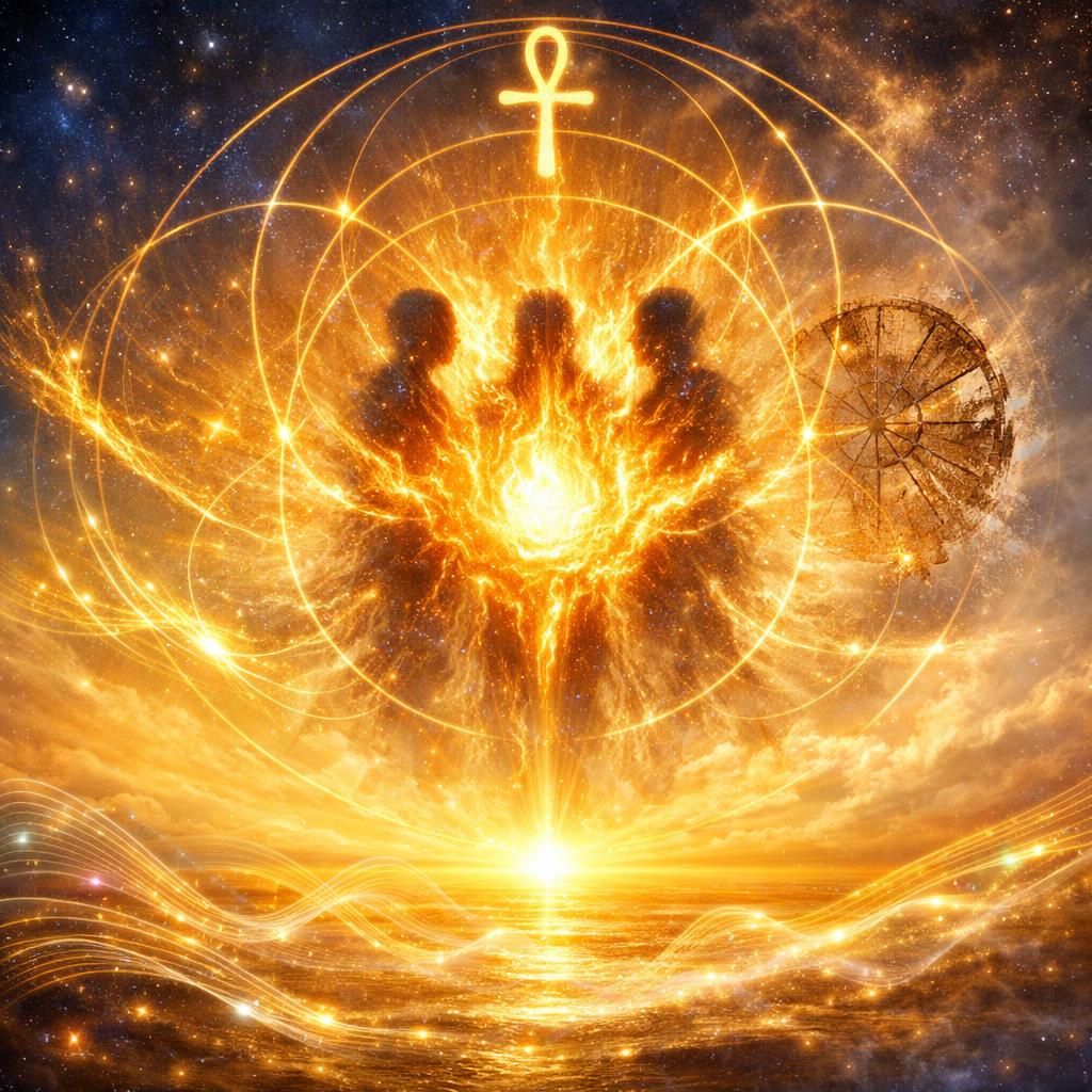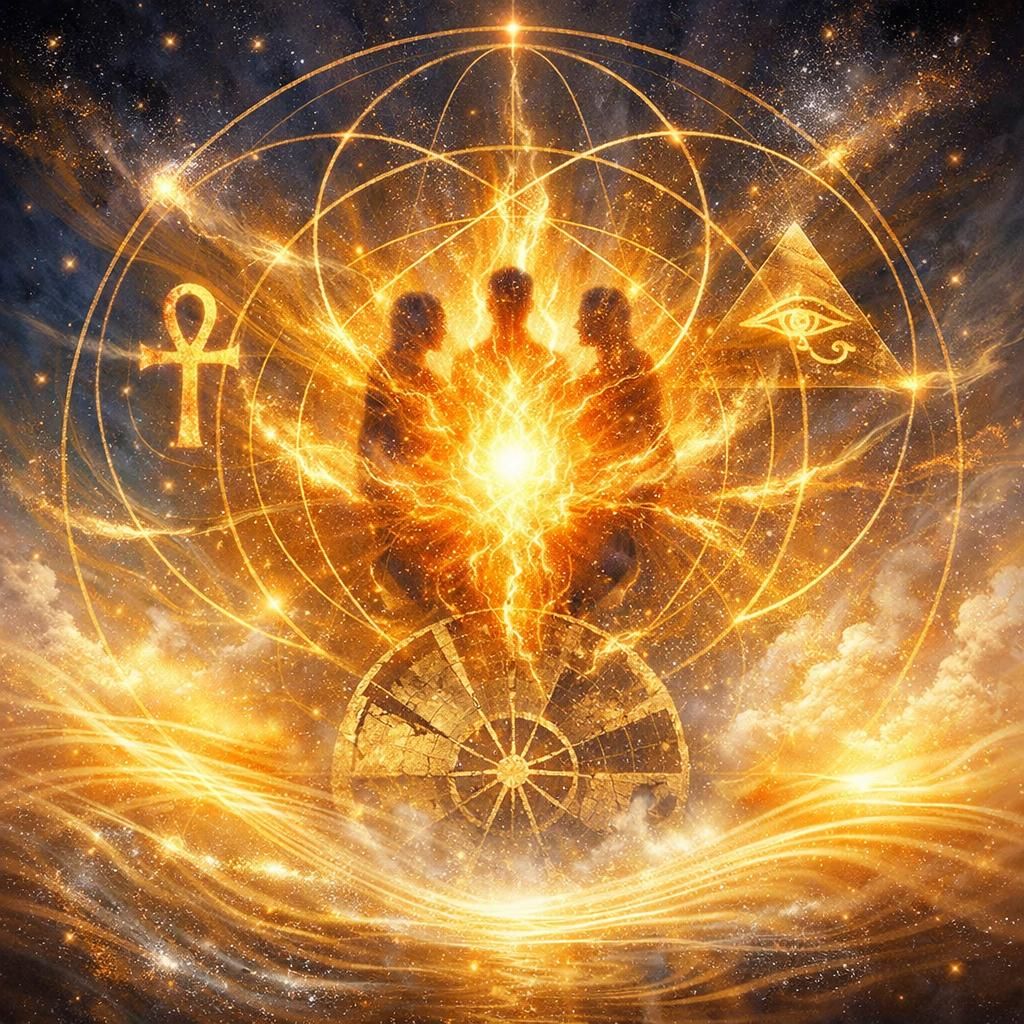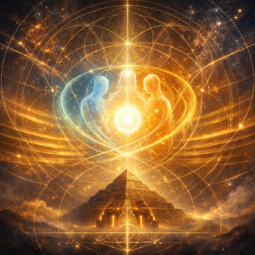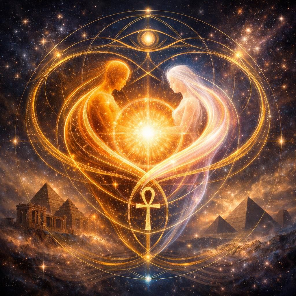 Mystical spiritual indie-folk ballad with karmic resonance and awakening, warm intimate male/female duet vocals (reflective tenderness building to harmonious unity), fingerpicked acoustic guitar, shimmering synth pads for frequency vibration, soft strings and light choir undertones, mid-tempo 78-88 BPM, spacious production evoking Egyptian geometry and etheric connection, emotional arc from karmic echo and self-questioning to WeBeWe resonance and soul merge, studio-quality hit potential with hypnotic chorus and emotional depth, perfect for spiritual awakening and twin flame playlists