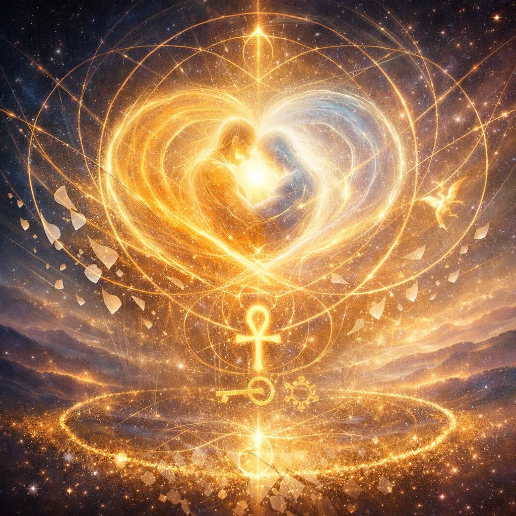 Transcendent spiritual orchestral-folk ballad with redemptive light and cosmic closure, powerful male/female duet vocals (reverent awe building to triumphant harmony), lush strings, soft piano, acoustic guitar, ethereal synth pads for golden ratio and Egyptian light, mid-tempo 78-88 BPM, cinematic production evoking karmic resolution and WeBeWe eternal oneness in shared sleeping dream across lifetimes, studio-quality hit potential with soaring chorus and profound emotional release, perfect for spiritual awakening, healing, and soulmate fulfillment playlists