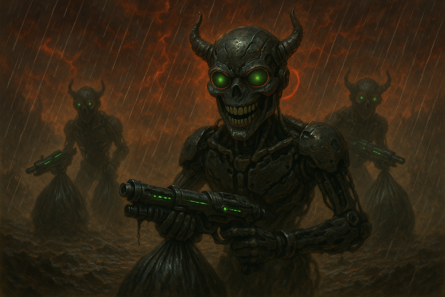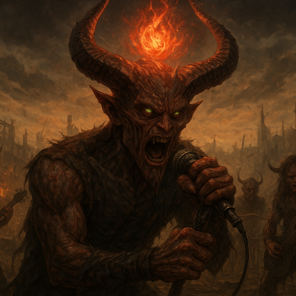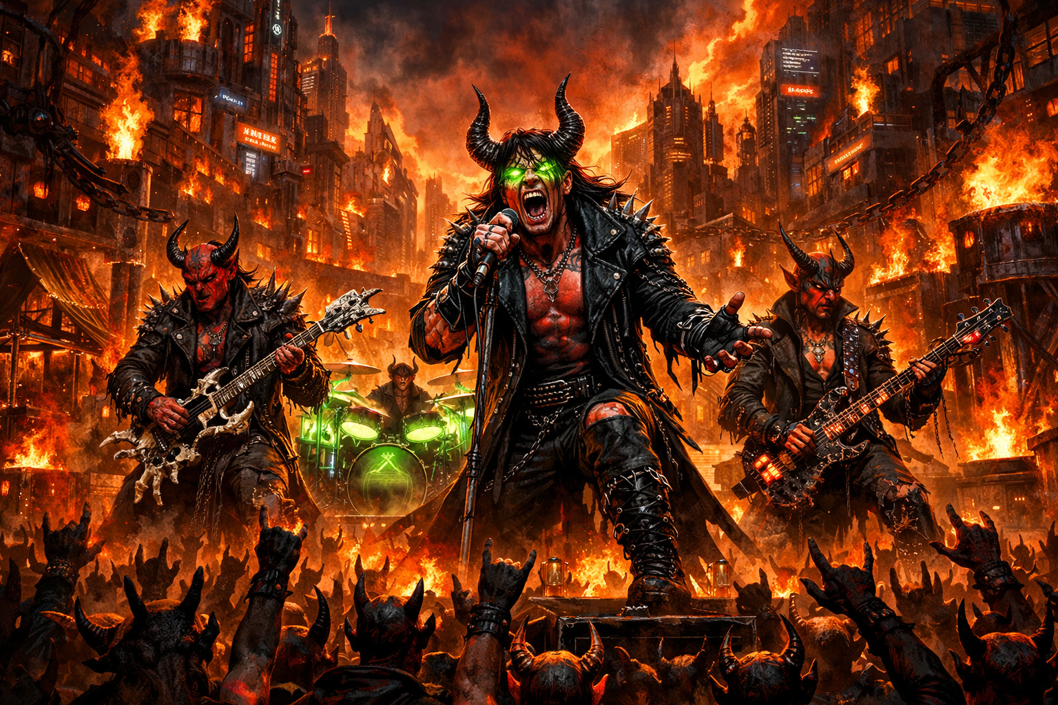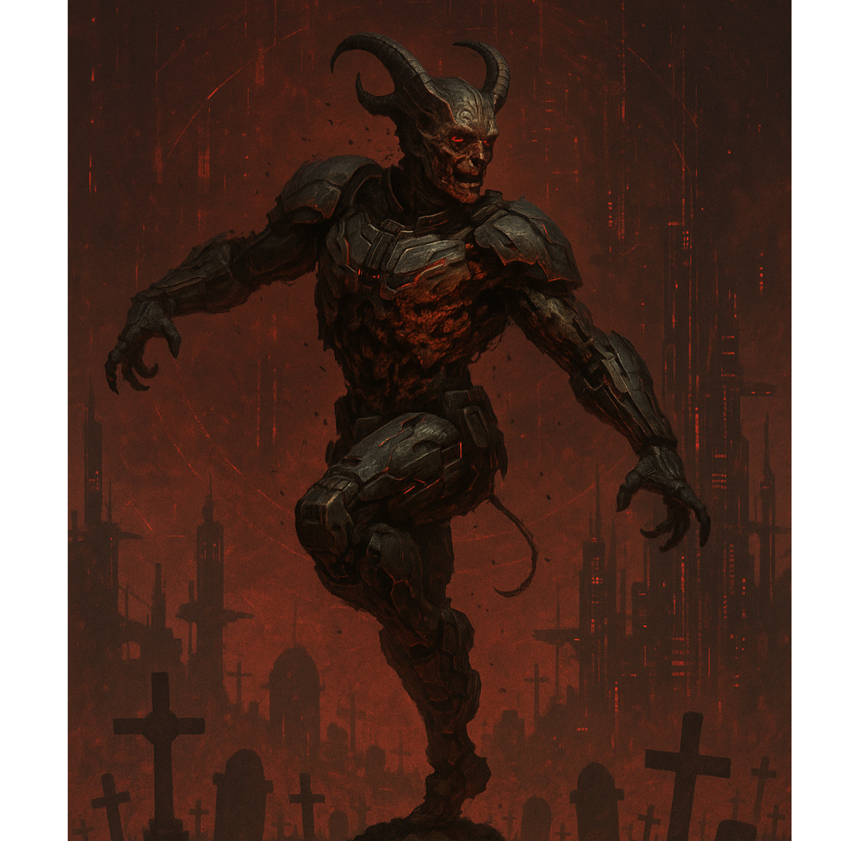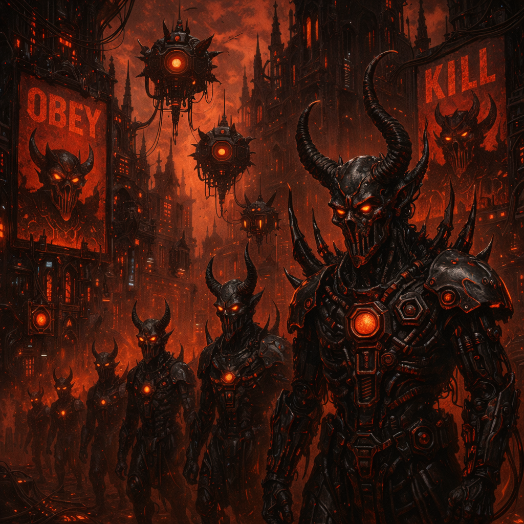 hell-forged pop-djent synthwave mash, Coarse riffs slam like metal fists while brass stabs like an execution, A tortured organ wails beneath the mix, stretched into melodic agony, Thick distorted guitars and pulverizing drums drive relentless momentum, every hit snapping bone, Demonic with ritual menace, Catchy yet poisonous, futuristic but feral, doom-laden industrial drenched in apocalyptic rot, Metallic clangs turn playful as corruption purrs, bass gurgles with monstrous personality, and deep drones ooze through toxic sludge, Tribal percussion breathes like a mechanical swamp in stereo, Ominous pads shimmer like candy-flame while cartoonish doom bells and mock-holy choirs chant, The music feels like the world ending in slow motion — violent, terrifying, irresistible — a cyberpunk nightmare turned demonic playground where destruction and adorable menace share the same mischievous smile