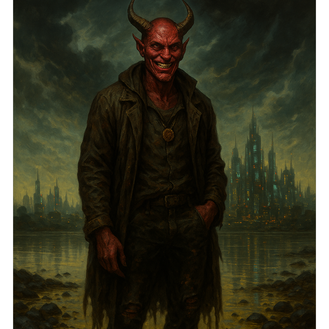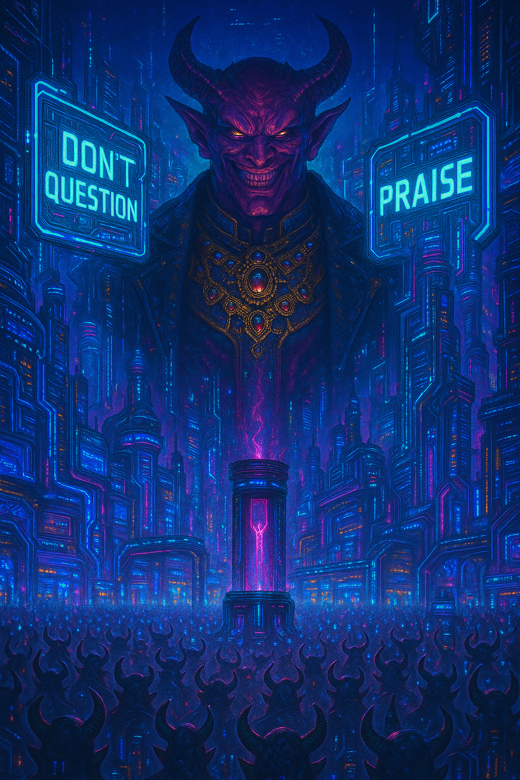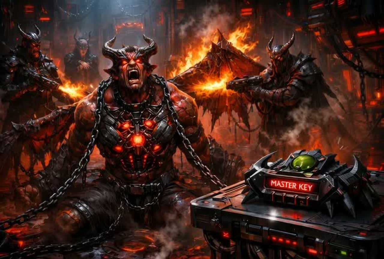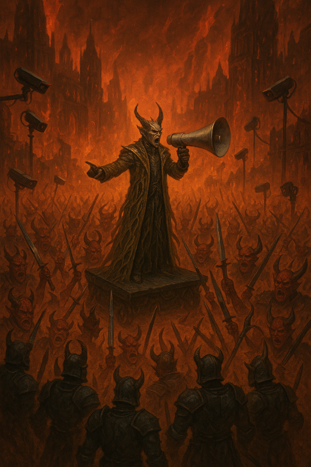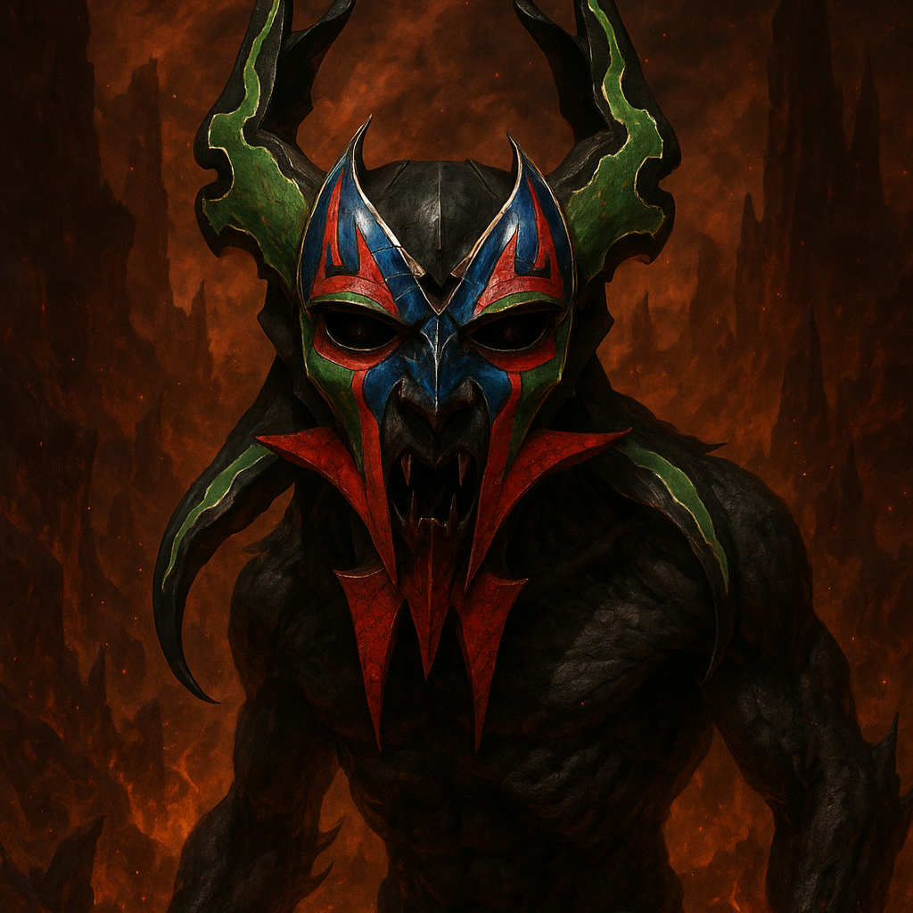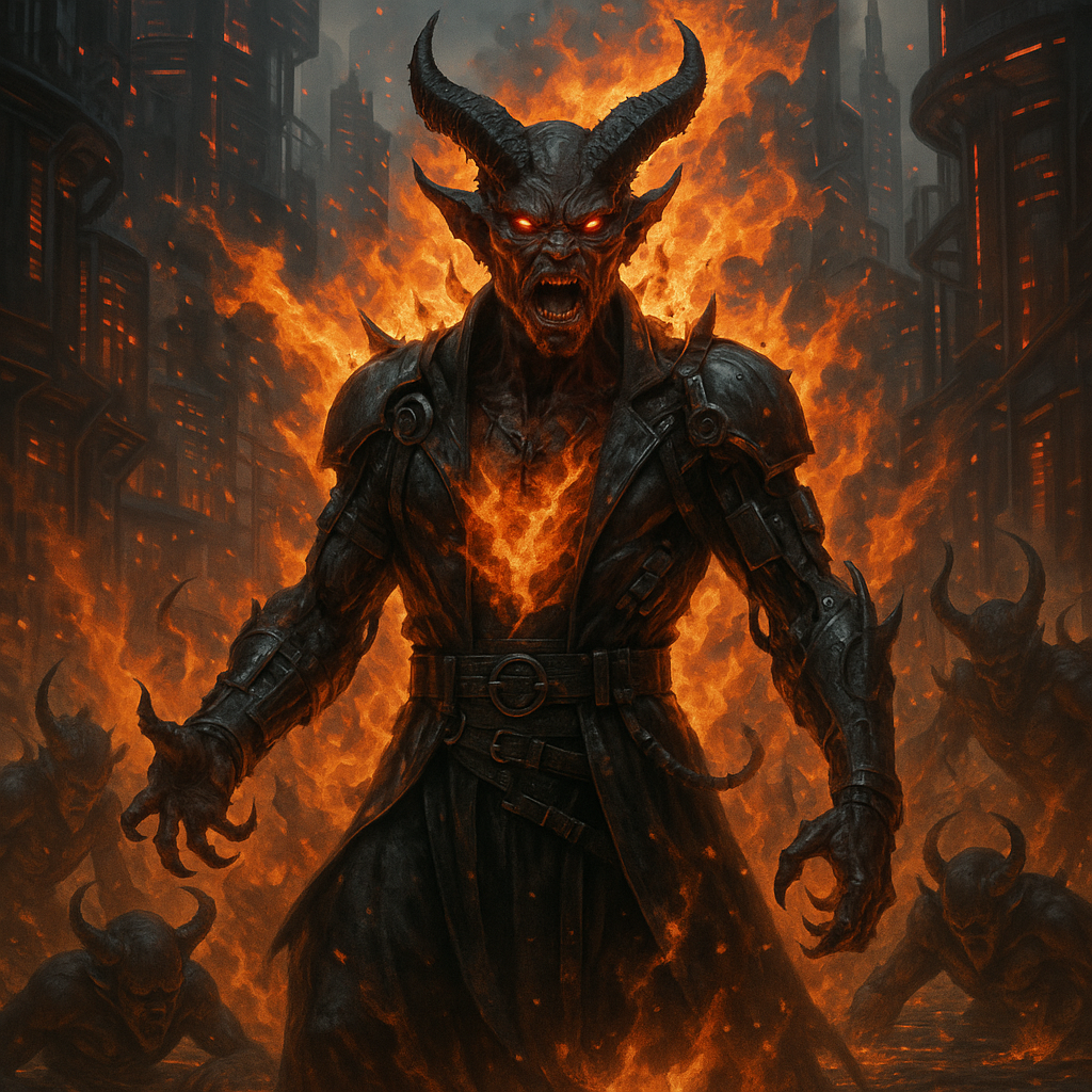 hell-forged pop-djent synthwave mash, Coarse riffs slam like metal fists while brass stabs like an execution, A tortured organ wails beneath the mix, stretched into melodic agony, Thick distorted guitars and pulverizing drums drive relentless momentum, every hit snapping bone, Demonic with ritual menace, Catchy yet poisonous, futuristic but feral, doom-laden industrial drenched in apocalyptic rot, Metallic clangs turn playful as corruption purrs, bass gurgles with monstrous personality, and deep drones ooze through toxic sludge, Tribal percussion breathes like a mechanical swamp in stereo, Ominous pads shimmer like candy-flame while cartoonish doom bells and mock-holy choirs chant, The music feels like the world ending in slow motion — violent, terrifying, irresistible — a cyberpunk nightmare turned demonic playground where destruction and adorable menace share the same mischievous smile