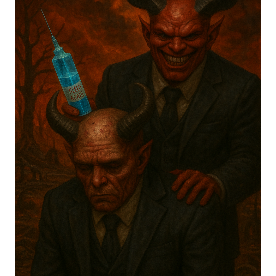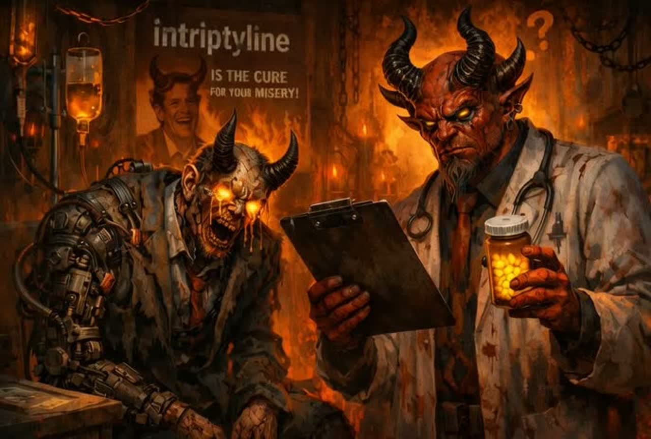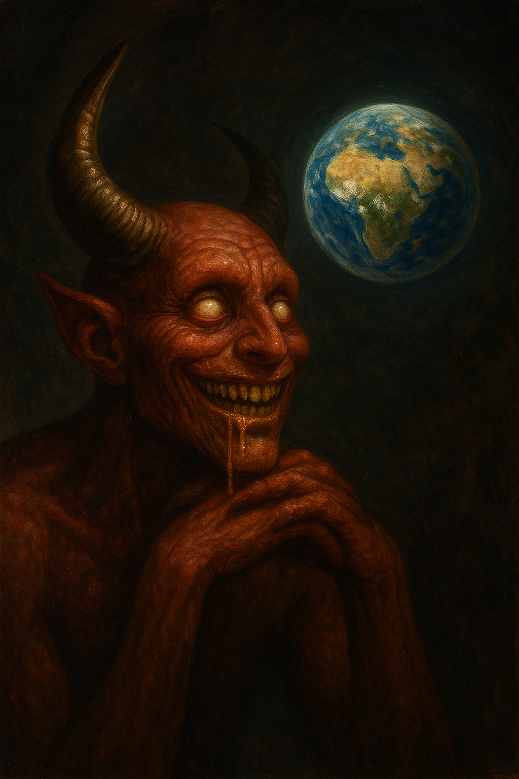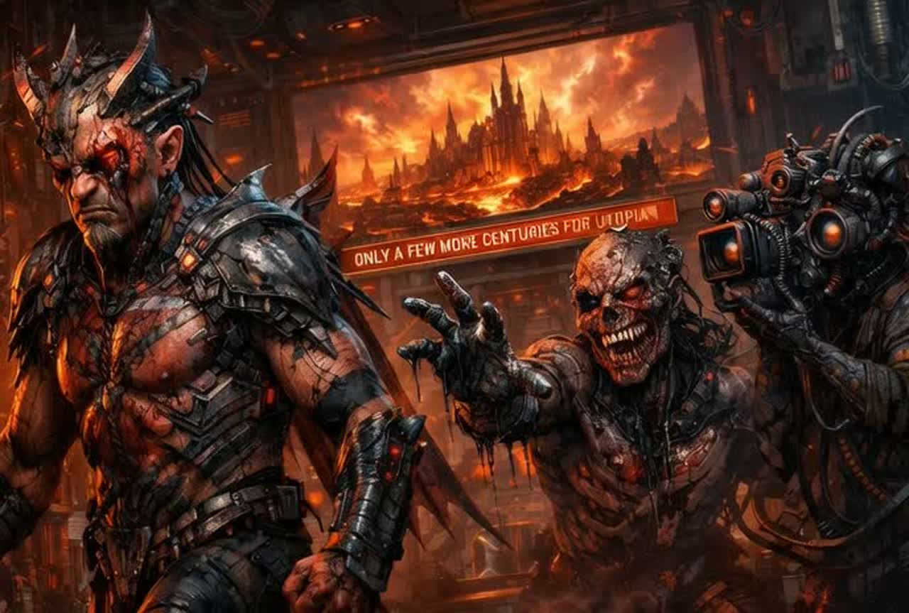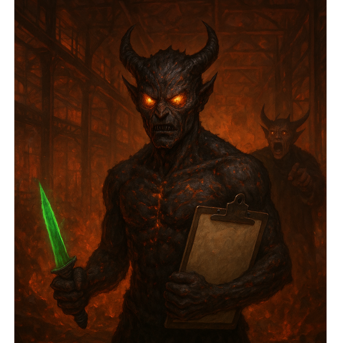 hell-forged pop-djent synthwave mash, Coarse riffs slam like metal fists while brass stabs like an execution, A tortured organ wails beneath the mix, stretched into melodic agony, Thick distorted guitars and pulverizing drums drive relentless momentum, every hit snapping bone, Demonic with ritual menace, Catchy yet poisonous, futuristic but feral, doom-laden industrial drenched in apocalyptic rot, Metallic clangs turn playful as corruption purrs, bass gurgles with monstrous personality, and deep drones ooze through toxic sludge, Tribal percussion breathes like a mechanical swamp in stereo, Ominous pads shimmer like candy-flame while cartoonish doom bells and mock-holy choirs chant, The music feels like the world ending in slow motion — violent, terrifying, irresistible — a cyberpunk nightmare turned demonic playground where destruction and adorable menace share the same mischievous smile