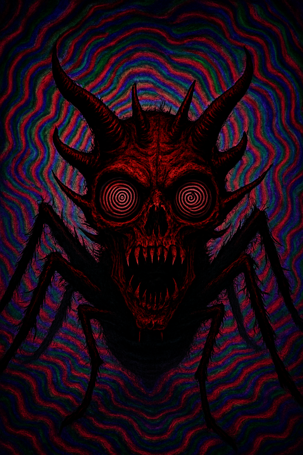 Create an epic, cinematic, and darkly hypnotic track that fuses quirky, adventurous energy with gothic, apocalyptic weight and alien death metal chaos, Layer whimsical odd-time melodies, playful instrumentation, and nostalgic hooks against haunting choirs, eerie ambient textures, rich orchestral swells, and mystical tones, Add gritty hip hop beats, blast beats, heavy metallic percussion, glitchy electronics, distorted synths, and crushing guitar riffs, all pulsing with deep sub-bass and planetary drones, Rhythms warp unpredictably with polyrhythms folding time as synthetic-organic instruments breathe, scream, and melt like cosmic machinery, Vocals are deep, raspy, and commanding—ritual chants, guttural growls, banshee screams—delivered over suffocating industrial underworld soundscapes, The atmosphere is whimsical yet suffocating, heroic yet terrifying, psychedelic and cathartic—evoking demon energy, alien transcendence, and a surreal dark fantasy apocalypse