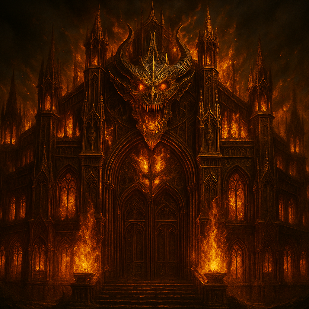 A brutal fusion of industrial ritual metal and demonic cybercore — grinding distortion, cybernetic percussion, and mechanical growls collide with apocalyptic phonk-trap rhythm, Metallic 808s, saw-toothed bass, and snapping snares pulse beneath choirs that chant like corrupted monks, Razor-edged strings slice through the mix with orchestral dread, while detuned guitars scream in glitching agony, Tribal drums pound like war hammers under machine-breath synths and metallic reverb, creating a grotesque, sacrilegious atmosphere, The sound drips with molten grime and divine corruption — half-temple, half-factory — a ceremony of chaos where brass, bass, and bone rattle in unison, Each hit feels ritualistic, each drop like a cyber-exorcism, pulsing with madness, distortion, and infernal groove