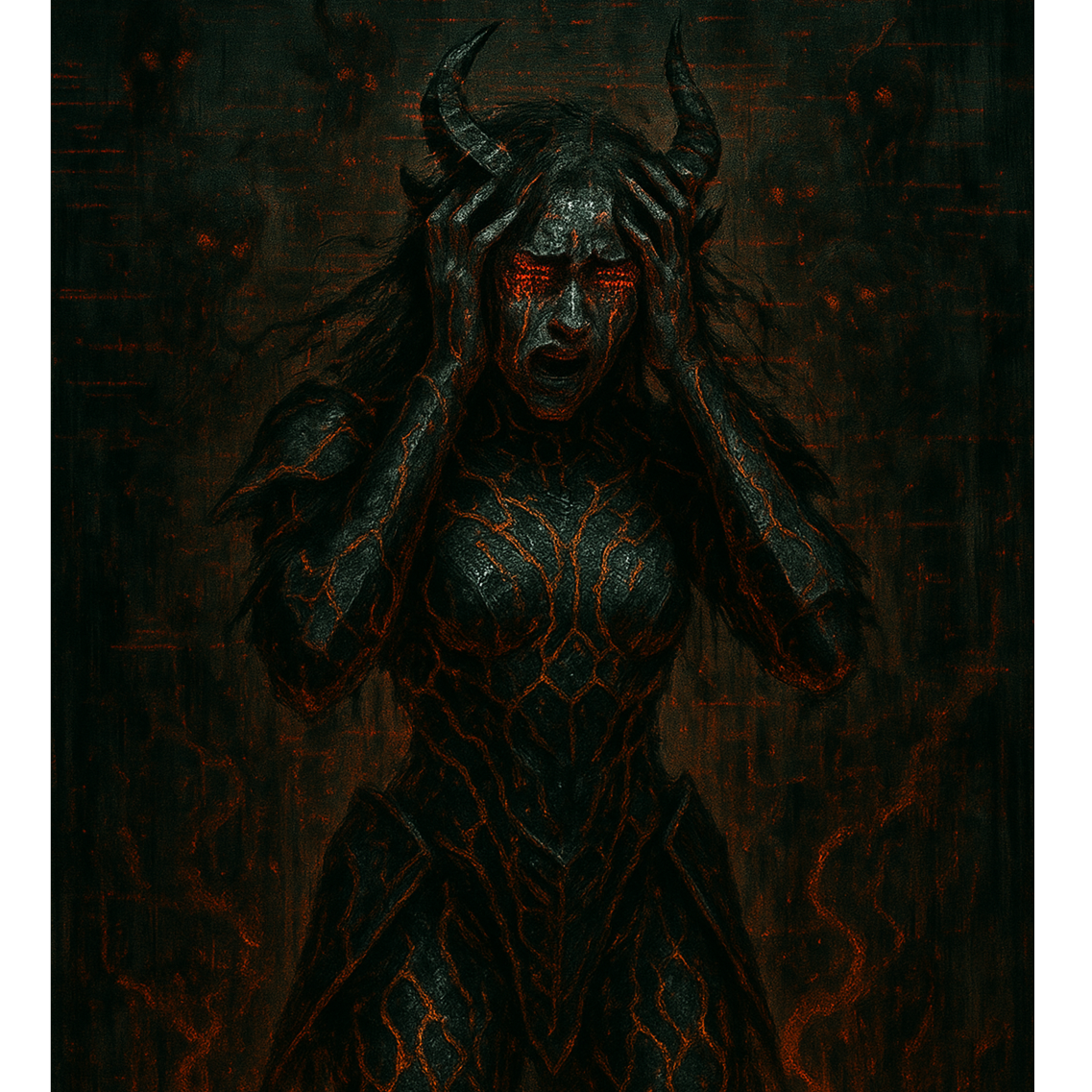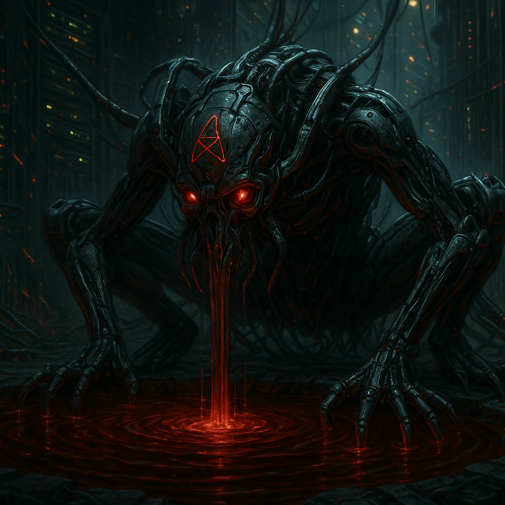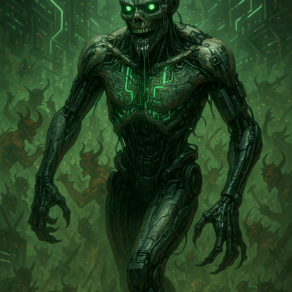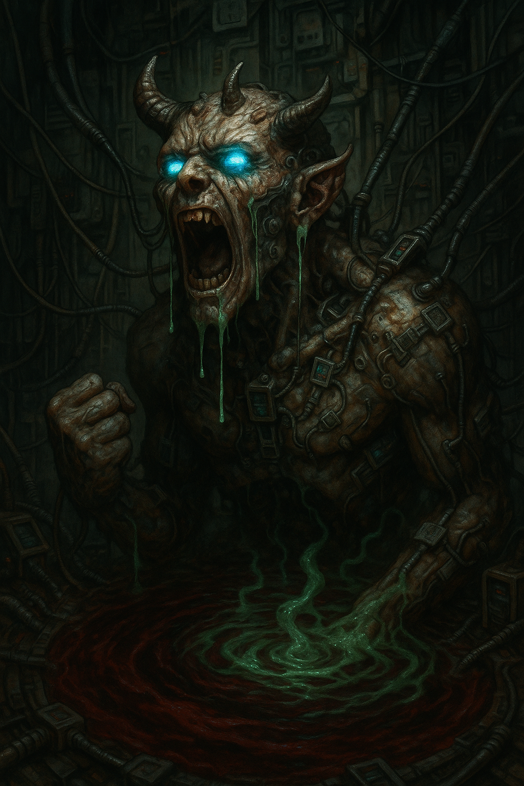 An industrial horror cyber apocalypse erupts — a rancid storm of grinding bass, Nasty growls rip from the earth like hell’s lungs exhaling fire, wobbling and snarling through chainsaw distortion, Rusted drums slam like collapsing factory doors, while cracked cathedral organs wheeze under burning stone, A defiled digital choir chants in corrupted code, swallowed by sub-bass birthed in the bowels of a dying machine, Screeching synths twist like tortured steel, glitching under the weight of their own madness, Each drop detonates like a collapsing reactor — violent, grimy, and divine in decay, Sparks rain from the circuitry as cybernetic ghosts scream through reverb and ash, The sound is unholy, futuristic, and oppressive — a war hymn for rusted and broken empires, pulsing with mechanical wrath and catastrophic beauty