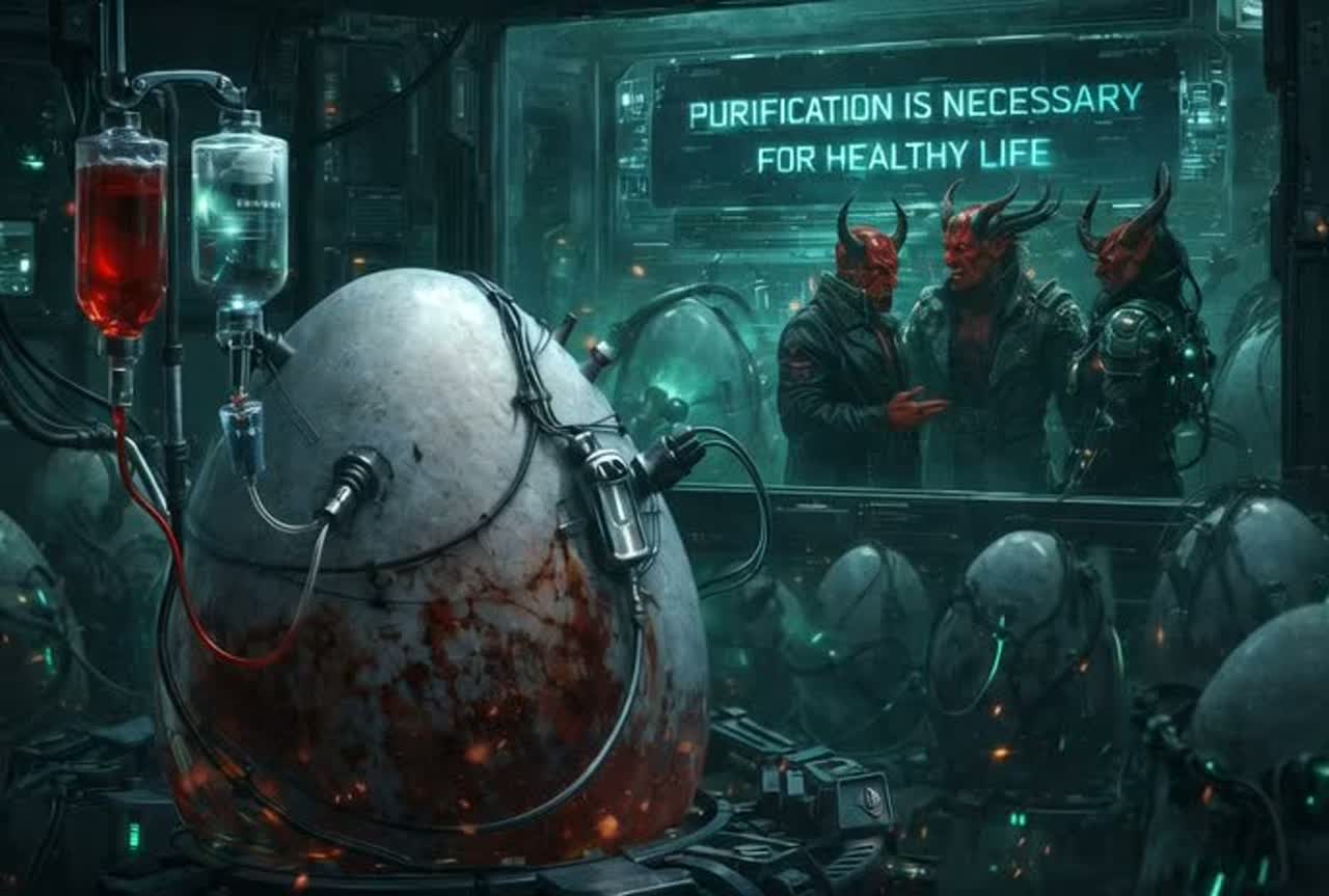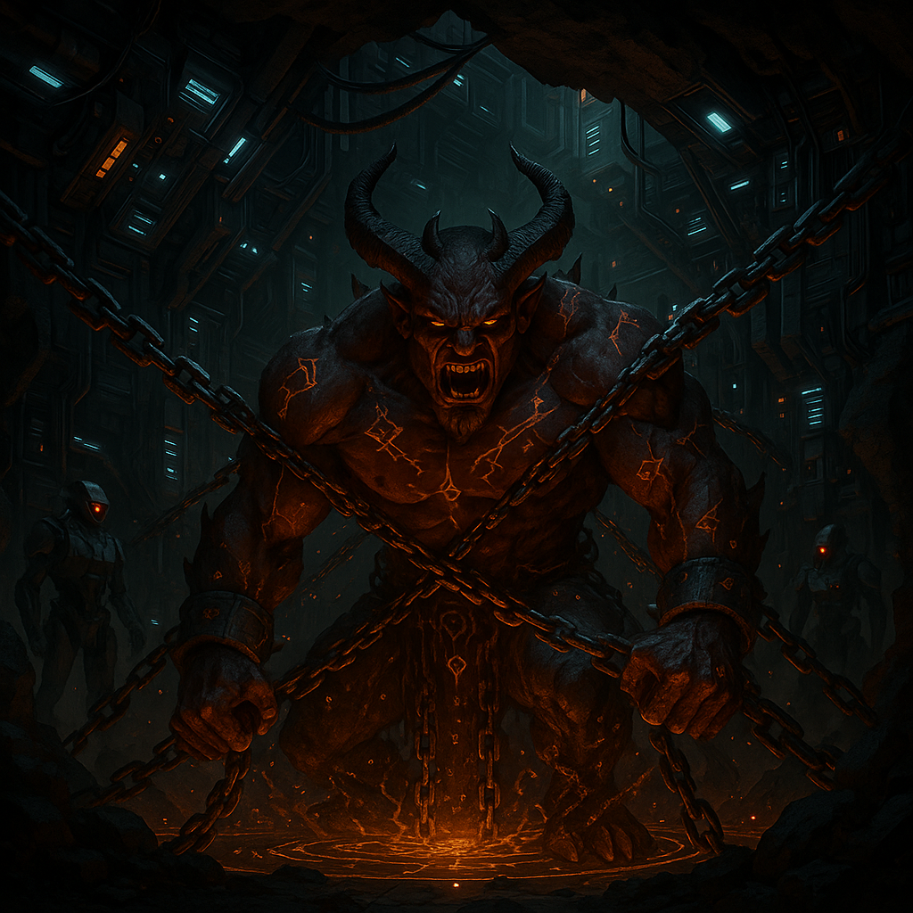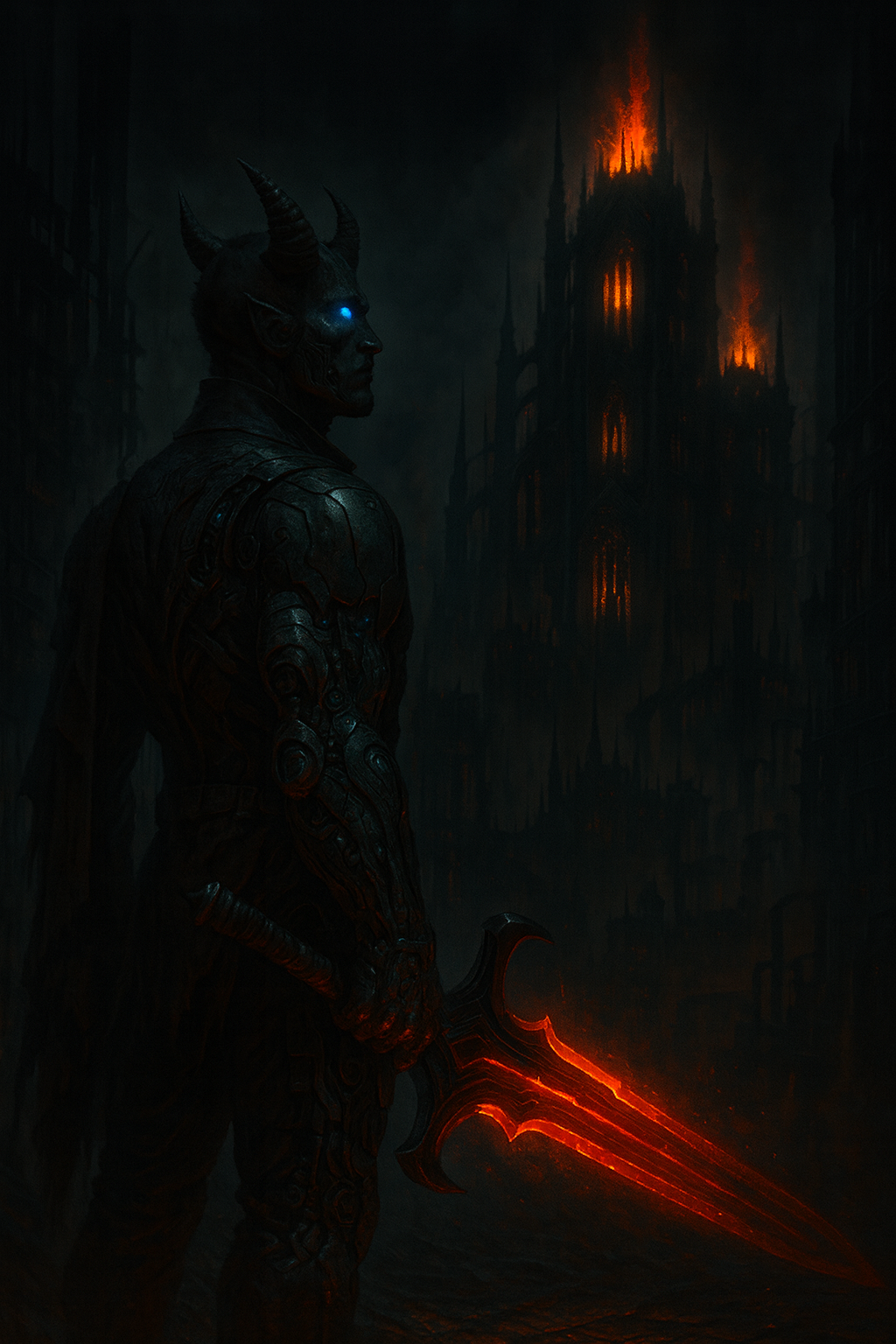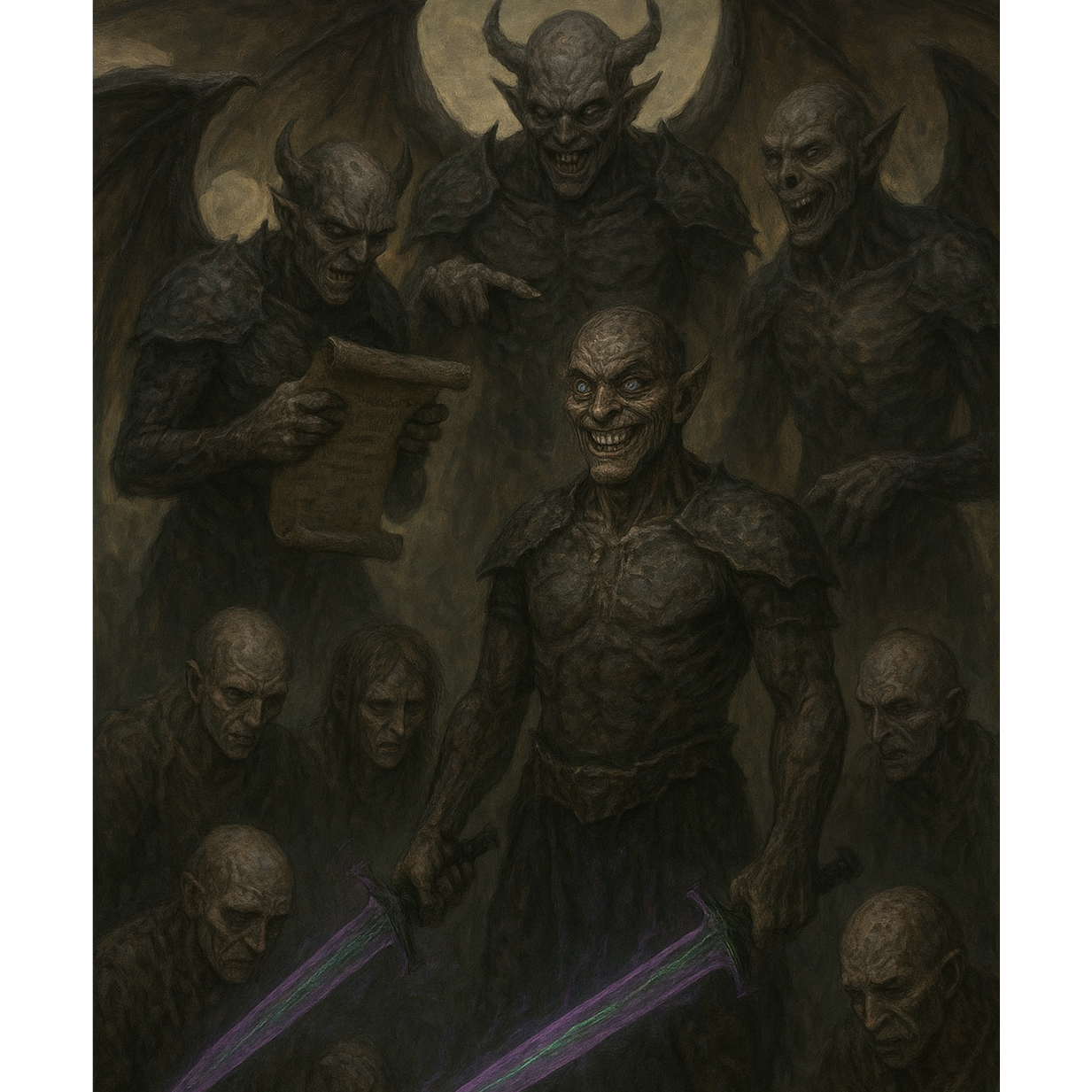 "Craft a dark, demonic instrumental that fuses ancient orchestral aggression with futuristic dystopian energy, Blend gothic dungeon ambience and baritone cello growls with glitchy, out-of-tune 808s and cybernetic synth textures, Inject gritty slap bass and hypnotic, catchy beatboxing for a raw, human rhythm, The atmosphere should feel like an unholy pact between a forgotten god and a corrupted machine — ancient yet extraterrestrial, ritualistic yet high-tech, Cinematic, violent, haunting