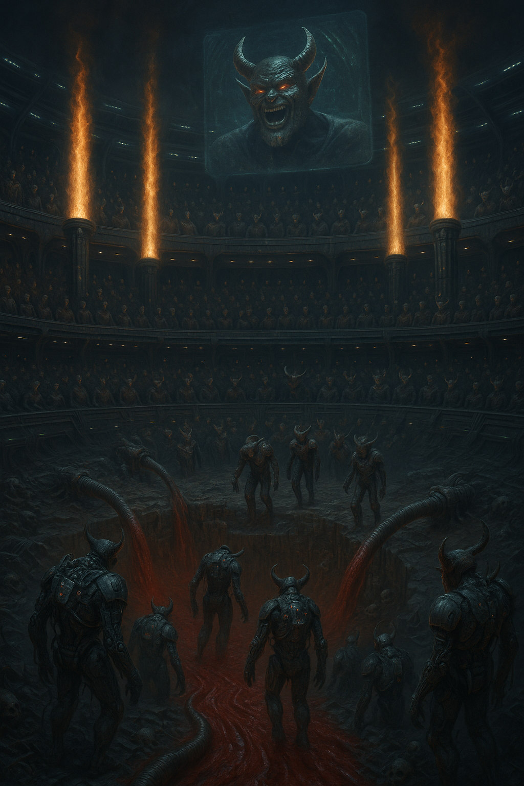 Create a ritual industrial cybercore track that feels like being ripped apart limb by limb in a colossal colosseum, The sound should hit like a sophisticated seizure—rhythmic, violent, terrifying, Bend synths into distorted hell-cries, warped metallic shrieks, and molten low-end pressure, Fuse industrial ritual metal with apocalyptic phonk-trap: metallic 808s, cybernetic percussion, and snapping snares beneath corrupted monk choirs, Add sacrificial chants, bone-snapping industrial impacts, razor-edged strings, and detuned guitars screaming in glitching agony, Tribal war drums pound under machine-breath synths, creating a grotesque half-temple, half-factory ritual, Vocals should be possessed, molten, growling like a soul being unmade, Atmosphere: occult, colossal, catastrophic—a divine execution pulsing with madness, distortion, and infernal groove