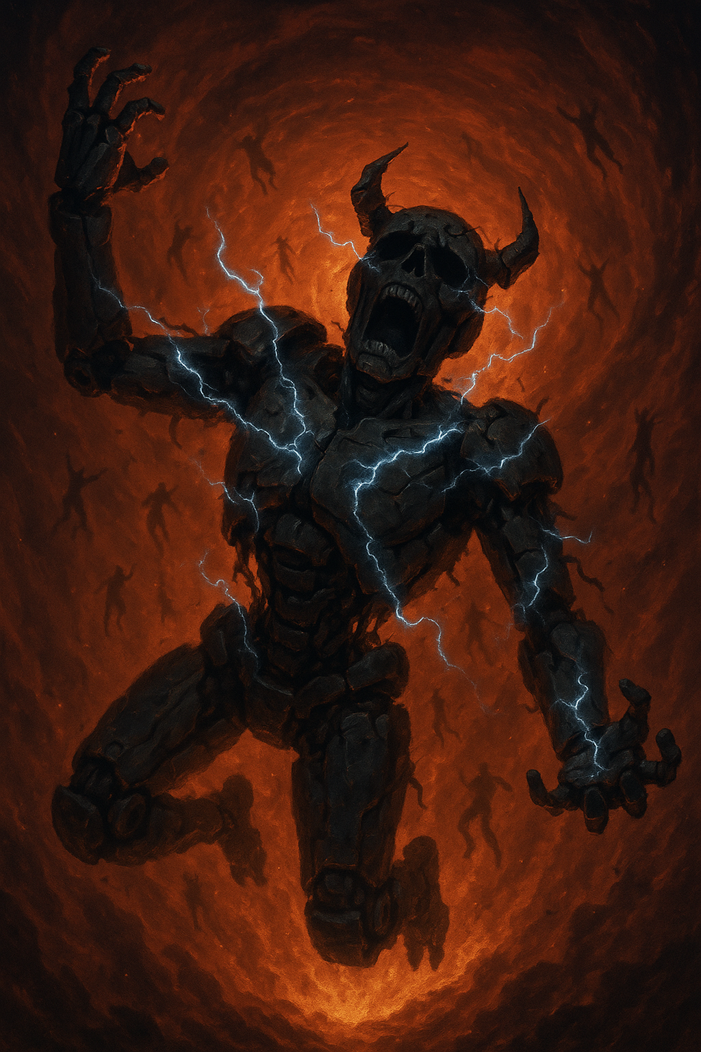 An unholy industrial horror symphonic soundscape forged as an intellectual banger, Instrumentally dense and punishing, liminal instruments flow like water while crackling with electricity, liquid metal conducting voltage through rusted machinery, Metallic gongs slam over tribal, militaristic percussion as a dying machine enters full rage mode, Detuned organs, colossal tubas, and razor-sharp strings stack into oppressive harmonic walls, twisted overtones screaming under pressure, Epic, god-weight drones pulverize and dominate the space, slow and inescapable, Beasts groan from the depths, heavy footsteps of a doomed army march forward, metallic scraping and fractured record scratches grind beneath hypnotic data beeps, Backward laser wails flicker between sacred dread and mania, possessed laughs slicing through like fractures of sanity, Insanity brewed with precision — deranged rage disciplined into control, corrupted divinity collapsing, false authority eroded by force and clarity
