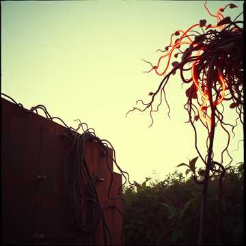 feels like an apocalypse with shrieking brass with whiplash, There are black magic clarinets choking on lack of air, A bubbling guitar made of fire pulses like a heart, An organ that is being bent and contorted into impossible shapes, metal chimes clang with decay, trumpets that are submerged in sludge, a bass line that gasps and warbles in hellish motion, violins with blustering strings that plunk and snap, dark slap cello, boomerang ethereal synths haunted by industrial machines