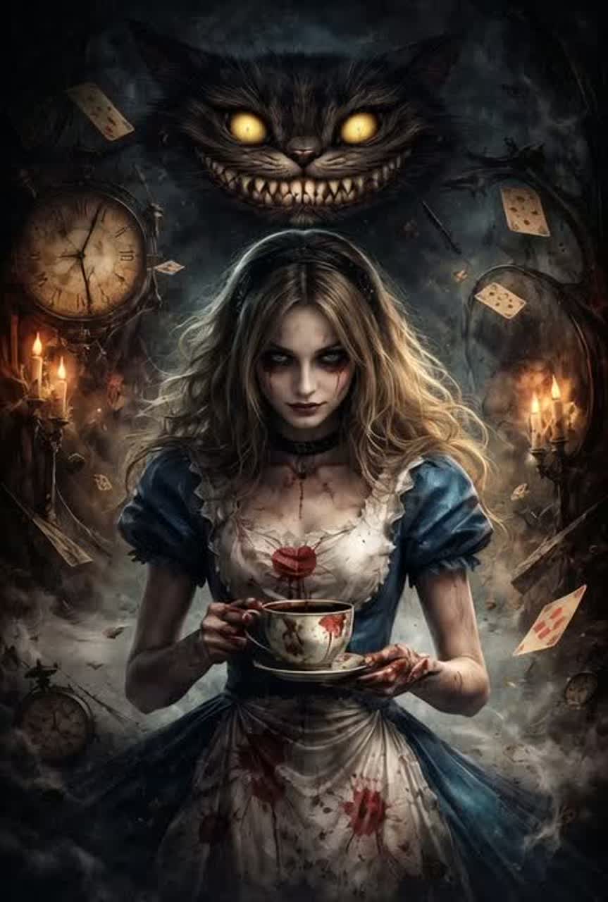 Dark alternative trap with industrial undertones and cinematic atmosphere, Slow, ominous build with minimal piano or detuned synths in the intro, featuring low, intimate spoken-word delivery, Verses remain restrained and tense, driven by deep sub-bass, crisp trap drums, and subtle glitch textures, Choruses hit hard with distorted low-end, layered vocals, and dramatic harmonic tension that feels heavy rather than chaotic, The bridge strips back to eerie ambience and whispered vocals before dropping into a crushing breakdown, Overall tone is surreal, psychological, and unsettling, blending twisted fairytale imagery with dystopian introspection, Mood is darkly lucid, confrontational, and controlled, never playful or whimsical