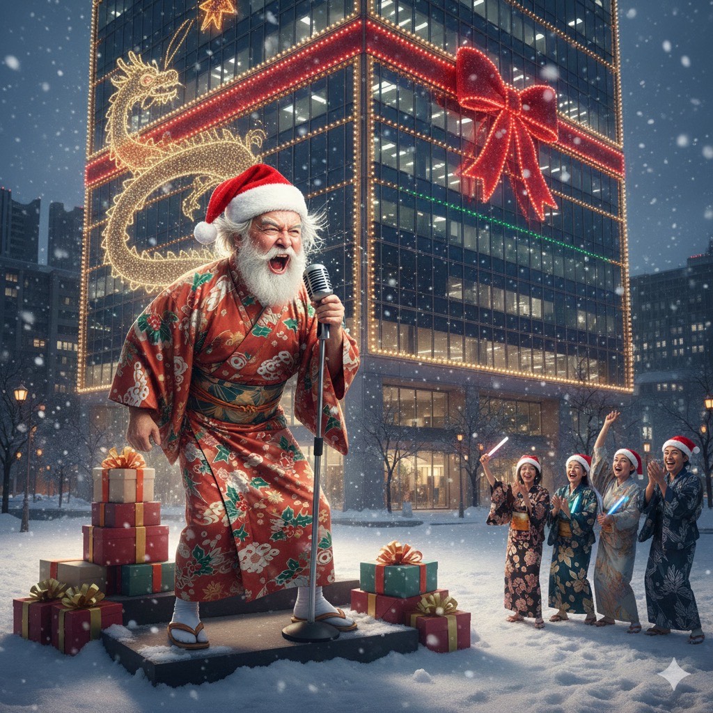 “Enka × Jungle fusion Christmas encouragement song with comedic Santa, Strong enka vibrato vocals, warm but dramatic tone, Fast jungle beat with deep bass, taiko-like percussion, shakuhachi and shamisen riffs, plus Christmas bells, Include rap-style interludes by ‘Enka Santa’—funny, energetic, spoken-word rap with friendly Kansai-style phrases, Lyrics structure: Intro → Verse1 → Rap1 → Chorus → Verse2 → Rap2 → Chorus → Verse3 → Rap3 → Chorus → Final Chorus, Theme: overworked people doing overtime, Santa appears to support them with enka-style encouragement and jungle rhythms, Make chorus powerful with the fixed phrase ‘Oh! Enka!! Ouenka!!’, Overall vibe: uplifting, humorous, heartwarming, festive, motivational, slightly theatrical, ”