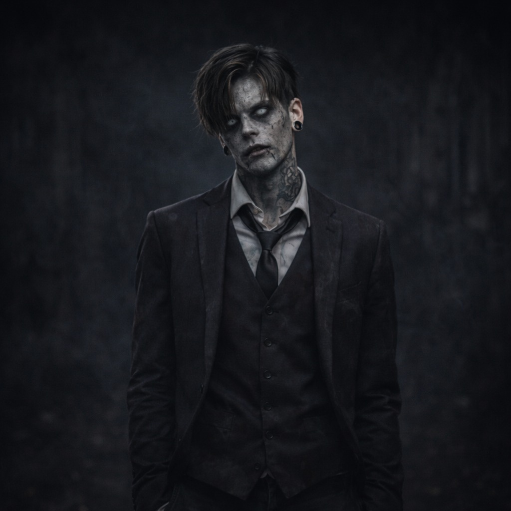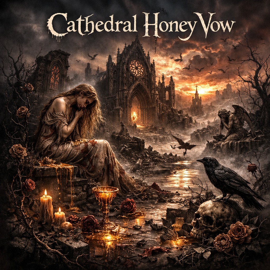 Slow early-90s gothic doom metal with deep gravelly baritone male lead and controlled aggression, drenched in atmospheric reverb and cathedral-room ambience, Verses sit in hoarse mid-range clean singing with subtle grit and tight rhythmic phrasing, introspective and phlegmatic over crawling down-tuned riffs, bass-forward weight, and roomy live drums, Choruses swell dynamically into tragic, powerful clean bellows that blend into guttural death growls for extra impact, keeping a storytelling focus and no high screams, Bridge drops into low demonic roars synced to bouncing riffs, with eerie lead guitar and funeral keys before collapsing back into the final crushing chorus and fading doom outro, ‑Bright modern pop sheen, ‑upbeat EDM drops, ‑hyperpop synths, ‑trap hi-hat rolls, ‑chipmunk vocals, ‑glossy autotune lead, ‑happy major-key choruses, ‑funky slap bass, ‑reggaeton dembow, ‑acoustic campfire folk, ‑country twang, ‑ska upstrokes, ‑modern djent chugs, ‑tech death blastbeat dominance, ‑chaotic breakcore, ‑overly clean polished drums, ‑comedic novelty vibes