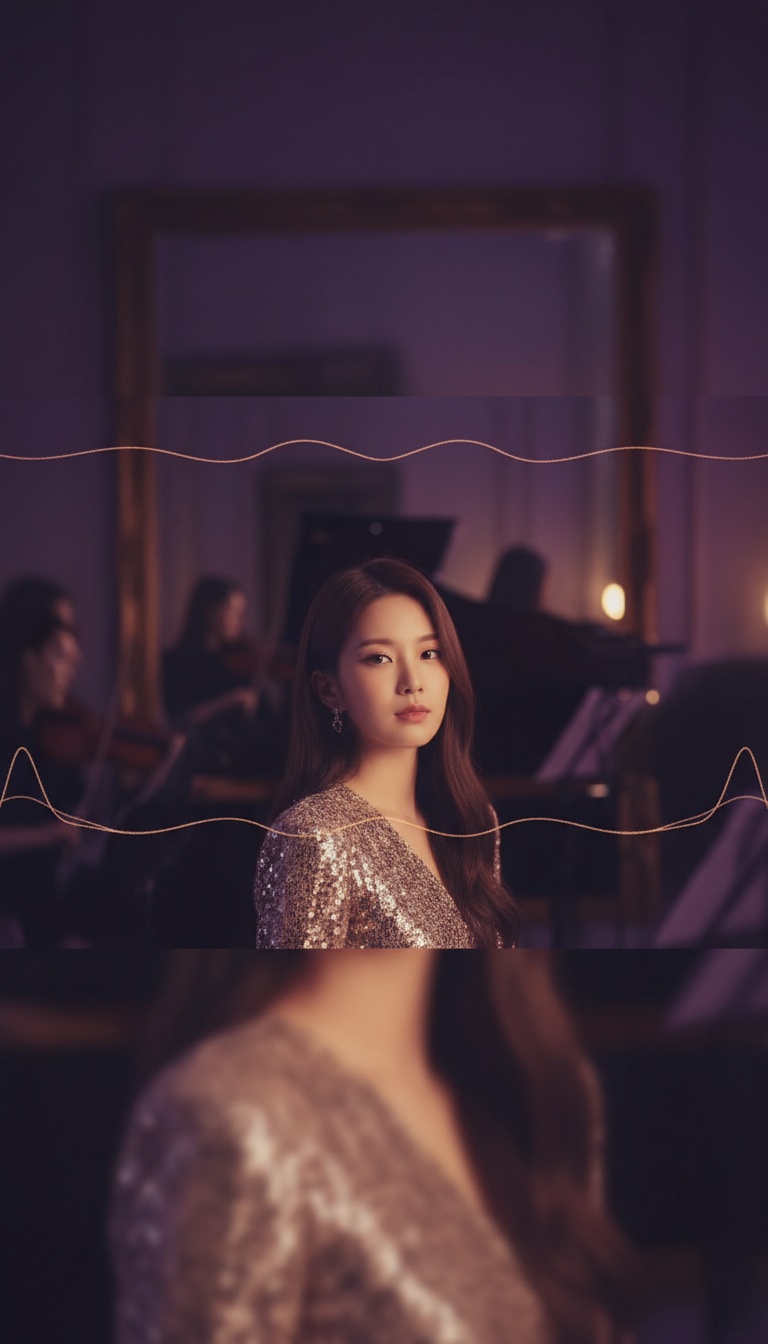 [music: Electronic reimagining of a K-drama style ballad, Tempo ~100 BPM, key D major, Hybrid between cinematic OST and ambient electronica, Deep analog synth layers, Moog-style sub, warm DX7 pads, slow sidechained drums, shimmering delay guitars, Starts from silence, then unfolds like rising energy, No sharp transients — only smooth power, The sound expands like breathing light, ]