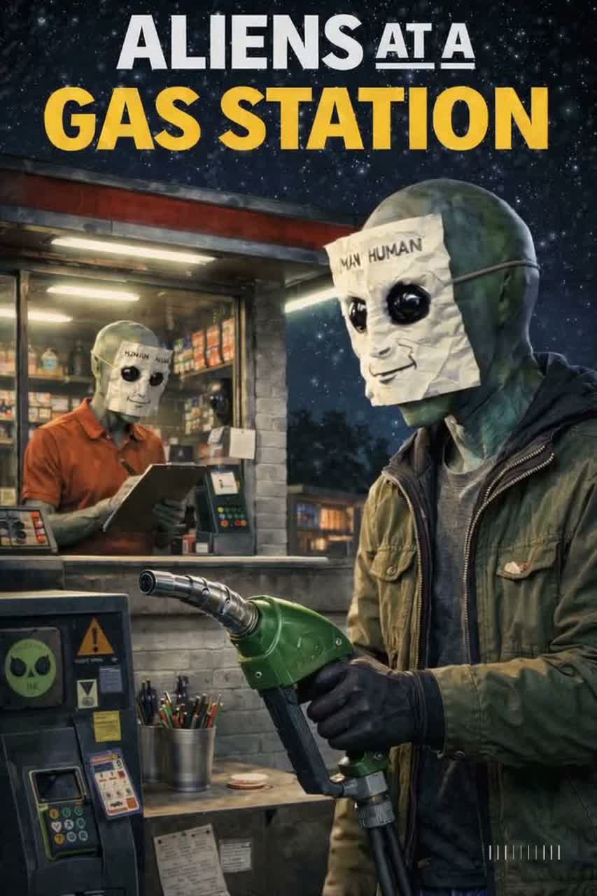 At 142 BPM in a minor-leaning key, A quirky sci-fi indie rock track set at a lonely gas station at night, opening with spacey synth pads and a loping bassline over crisp drums, Verses add twangy guitars and warm analog warble that hints at alien tech, Short radio-station retune sweeps and bursts of static appear as quick scene cues between phrases, like searching for a signal, The chorus bursts into distorted riffs and playful arpeggios, bigger but still grounded, Bridge leans into theremin-like textures and static-laden samples, with an occasional vending-machine can-drop thunk as a punchy accent, Keep it cinematic, weird-funny, and roadside-real—never cute, Theme: aliens disguised as humans who observe humans for research purposes and run a gas station in the middle of nowhere