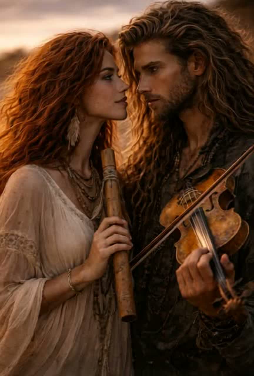 Dark Desert Folk × Mystic Nomad Violin × Ethereal Wind Folk, cinematic ritual atmosphere, DUET ONLY, STRICT ORDER, CLEAR DISTINCT VOICES, NO BLENDING, Tempo 88–92 BPM, Mood: mystical, emotional, desert night, Male voice: deep, warm, slightly raspy, grounded storyteller, Female voice: soft, airy, breathy, slightly rough, intimate, wind-like, Instruments: prominent emotional violin (male lead), expressive native flute (female lead), tribal drums (heartbeat), low bass pulse, acoustic guitar, ambient pads, desert wind, Structure: intro violin + wind, Verse 1 male (low, intimate), Verse 2 female (soft, flute enters), Pre-chorus alternating lines, Chorus both (layered, male grounded, female floating, violin + flute call & response), Verse male, Verse female (whispered), Bridge instrumental (violin vs flute dialogue), Final chorus full power, Outro female + flute, Production: cinematic, organic, warm, wide stereo, no EDM, no pop, no autotune, Violin & flute clearly leading