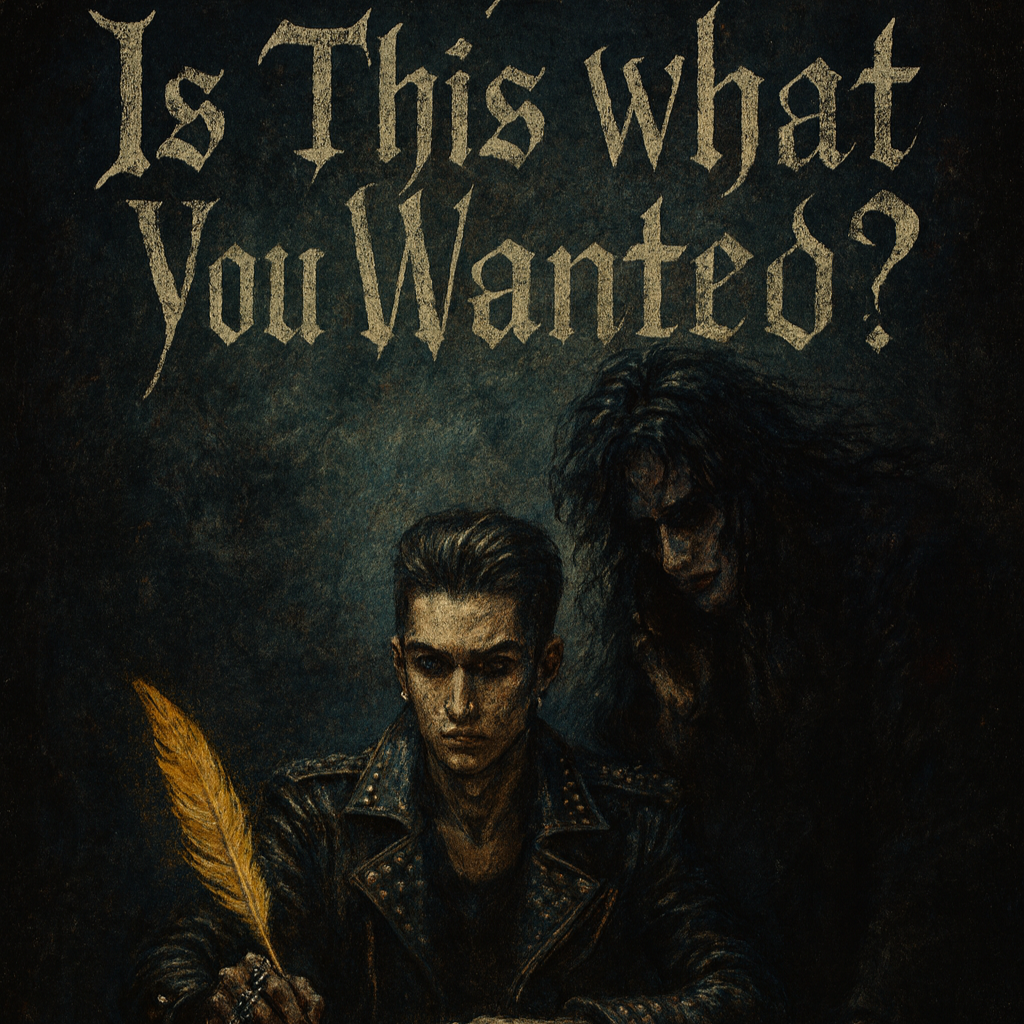 Gothic rock, BPM 125, Dark but stylish and emotional, Heavy distorted guitar riffs with soaring leads, clean arpeggios in verses, deep bass, atmospheric piano and strings, energetic drums with tom fills, Intro and outro include natural amplifier feedback noise for live feel, Japanese female vocal, bright and clear, charismatic and cool with strong stage presence, Key phrases “Is this what you wanted?” with echo, every chorus ends with “I’m just a simple madness man”