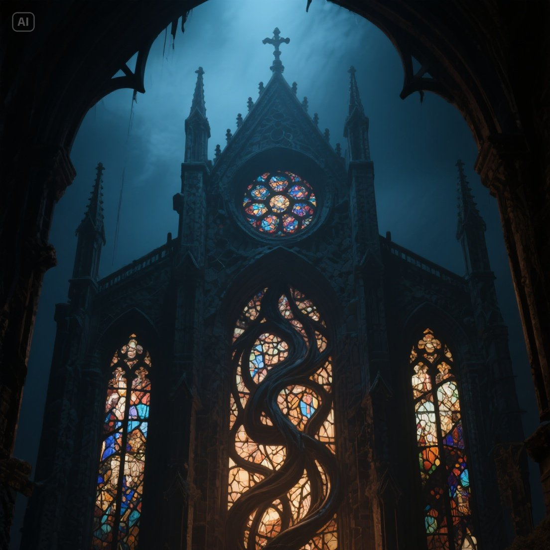 experimental gothic rock, BPM 120-130, male vocals with clear and ethereal tone, fused with heavy metal intensity, dark and twisted atmosphere, soaring distorted guitars with haunting gothic riffs, pounding double bass drums, driving bass guitar, industrial metallic noise layers, eerie choirs, cinematic cathedral organ, chaotic experimental textures with glitchy edits, ominous orchestral strings weaving in and out, strange dissonant harmonies, surreal breakdowns, gothic atmosphere remains the main focus, madness and darkness collide in a powerful and insane soundscape