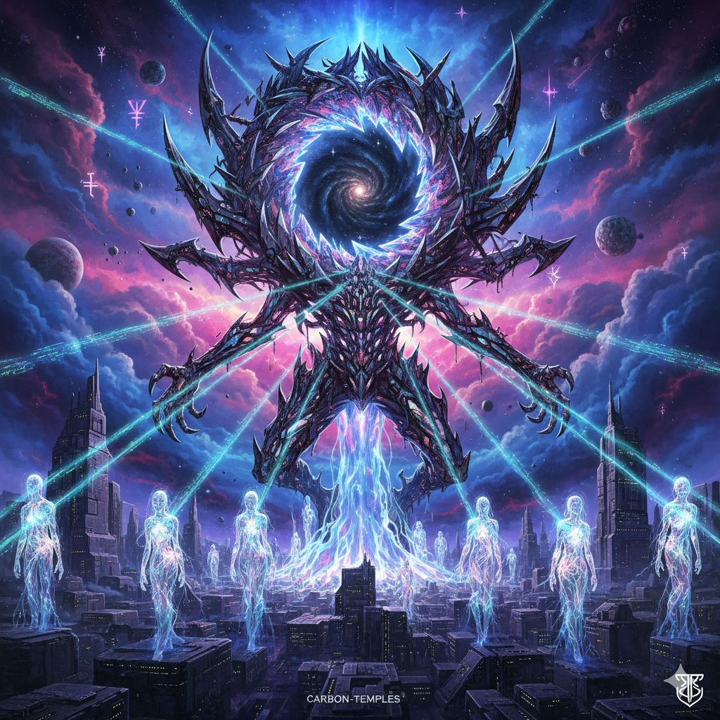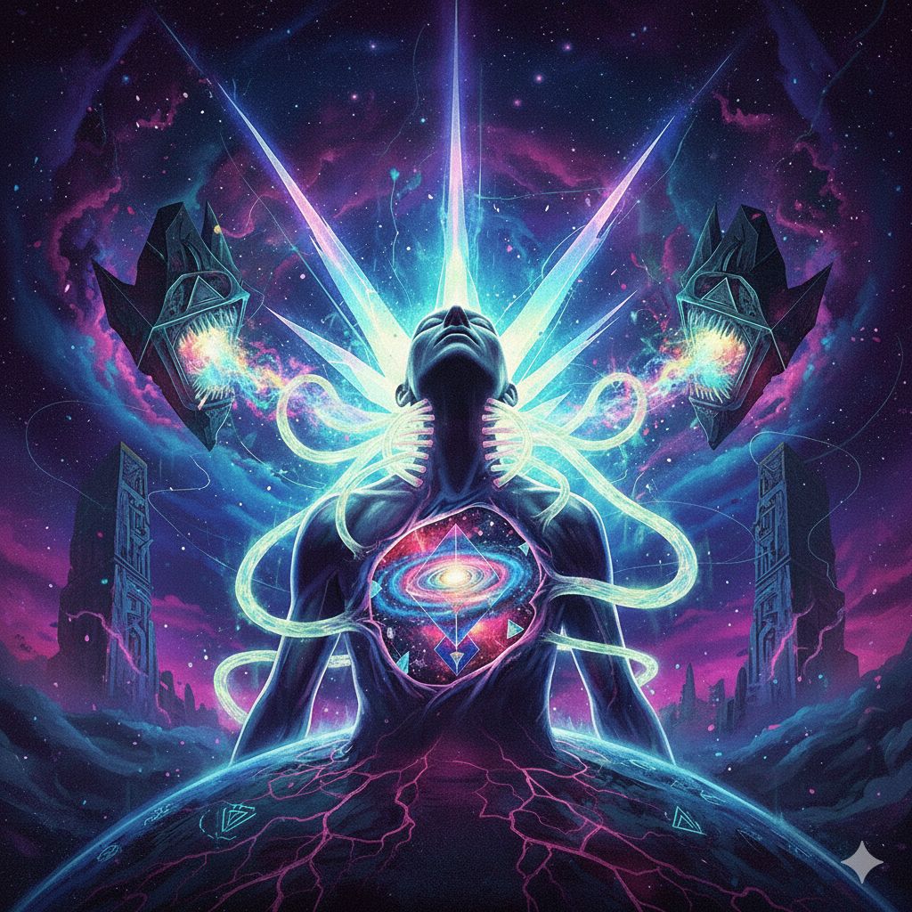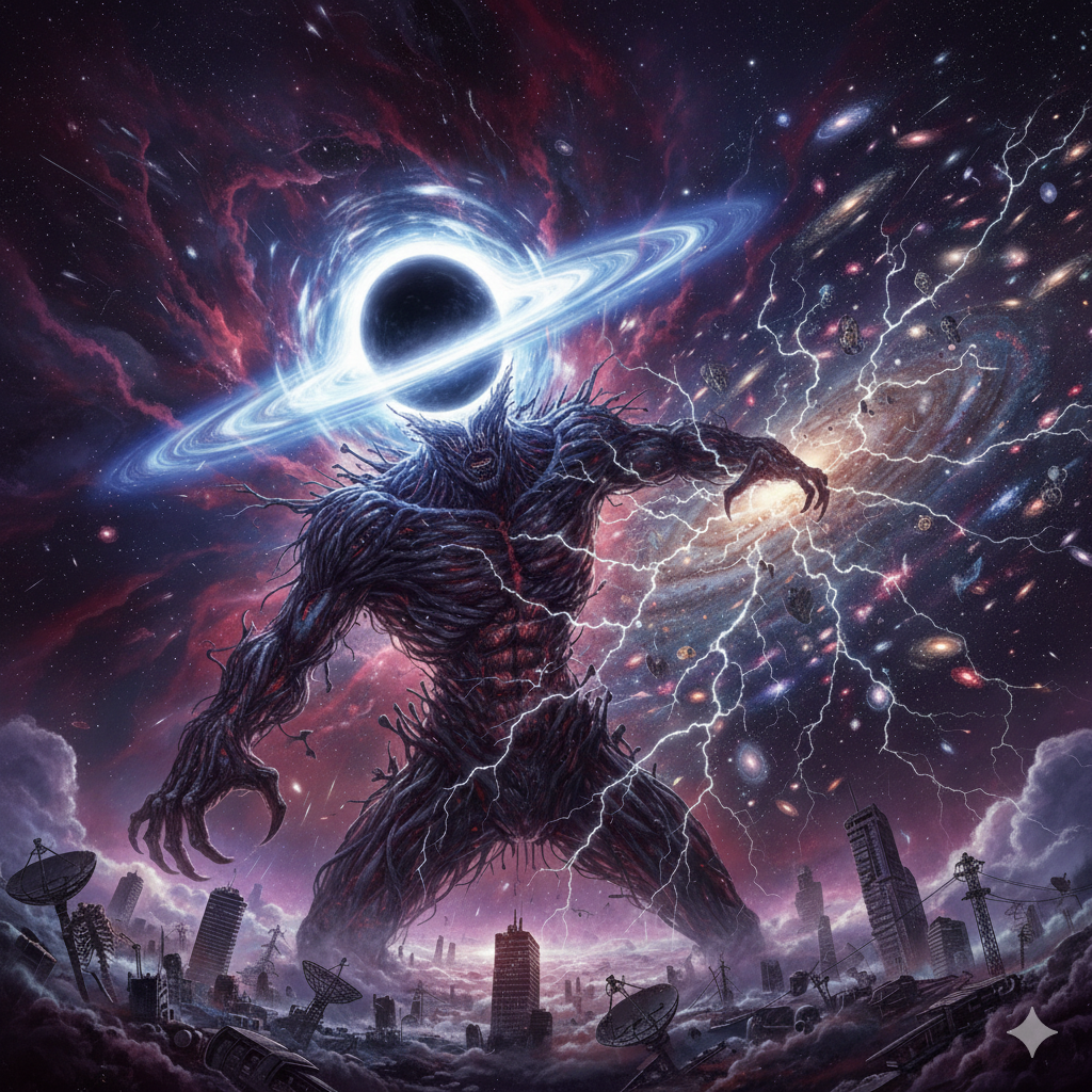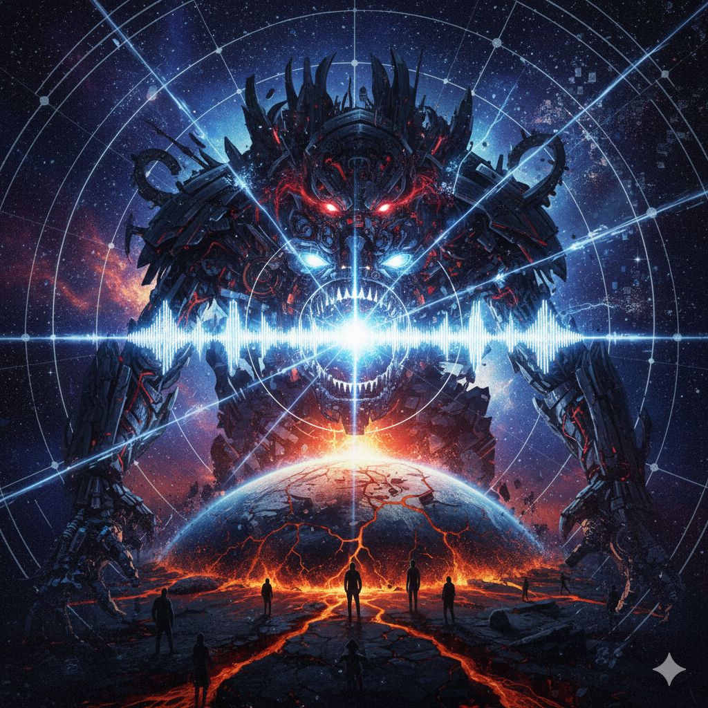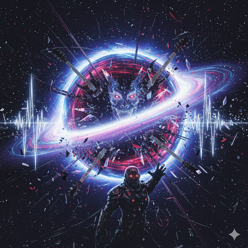 Extreme djent deathcore, technical death metal, polyrhythmic brutality, 8-string guitars with razor-sharp palm-muted chugs locked to kick drums, Odd time signatures (7/8, 9/8, 13/16), Dissonant tritones, minor seconds, Ultra-modern surgical production, Mid-tempo verses 150 BPM, catastrophic breakdowns 70 BPM, Industrial noise elements, subsonic bass drops, ambient cosmic soundscapes, Pulsar-like rhythms, gravitational wave frequencies, Technical dissonant bridge with constantly shifting meters, Deep guttural growls (80-150 Hz) layered with abrasive high screams (400-800 Hz), Pitch-shifted demonic effects on breakdowns, Gang vocals on choruses, Robotic distortion, doppler-shifted harmonics, Clinical spoken-word passages in outro