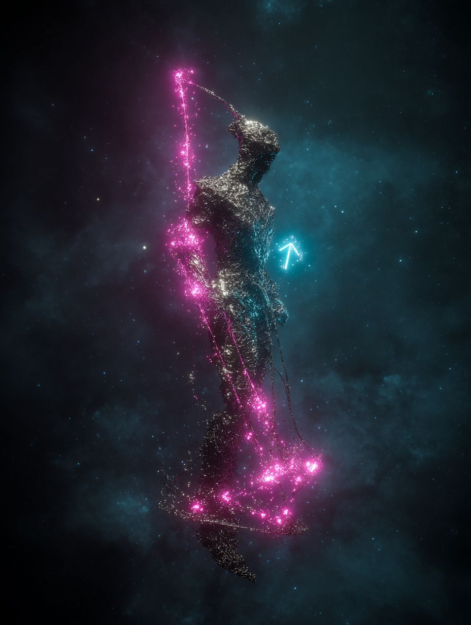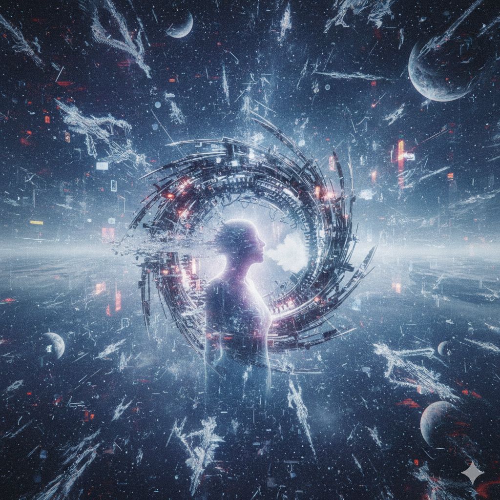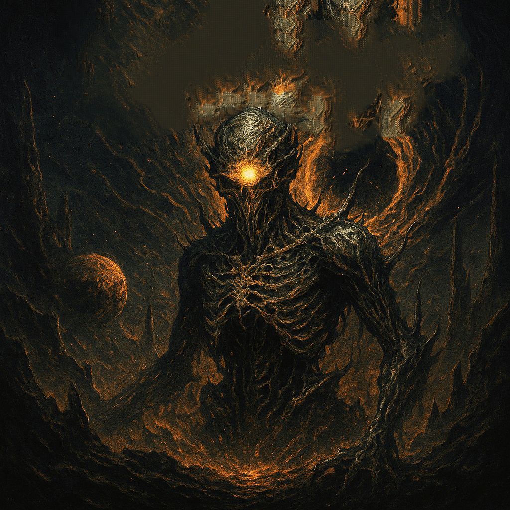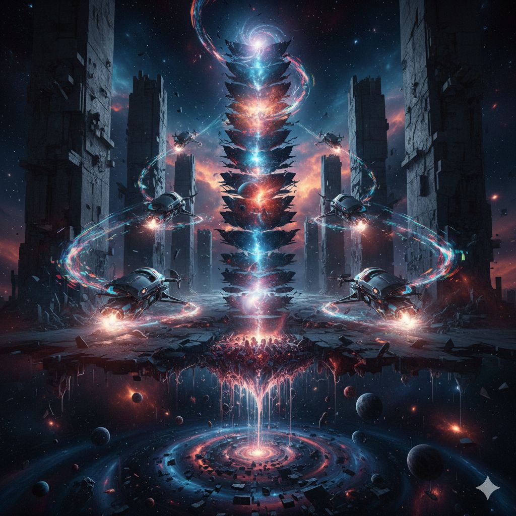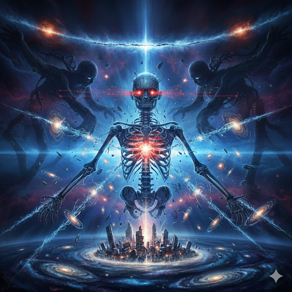 Extreme djent deathcore, technical death metal, polyrhythmic brutality, 8-string guitars with razor-sharp palm-muted chugs locked to kick drums, Odd time signatures (7/8, 9/8, 13/16), Dissonant tritones, minor seconds, Ultra-modern surgical production, Mid-tempo verses 150 BPM, catastrophic breakdowns 70 BPM, Industrial noise elements, subsonic bass drops, ambient cosmic soundscapes, Pulsar-like rhythms, gravitational wave frequencies, Technical dissonant bridge with constantly shifting meters, Deep guttural growls (80-150 Hz) layered with abrasive high screams (400-800 Hz), Pitch-shifted demonic effects on breakdowns, Gang vocals on choruses, Robotic distortion, doppler-shifted harmonics, Clinical spoken-word passages in outro