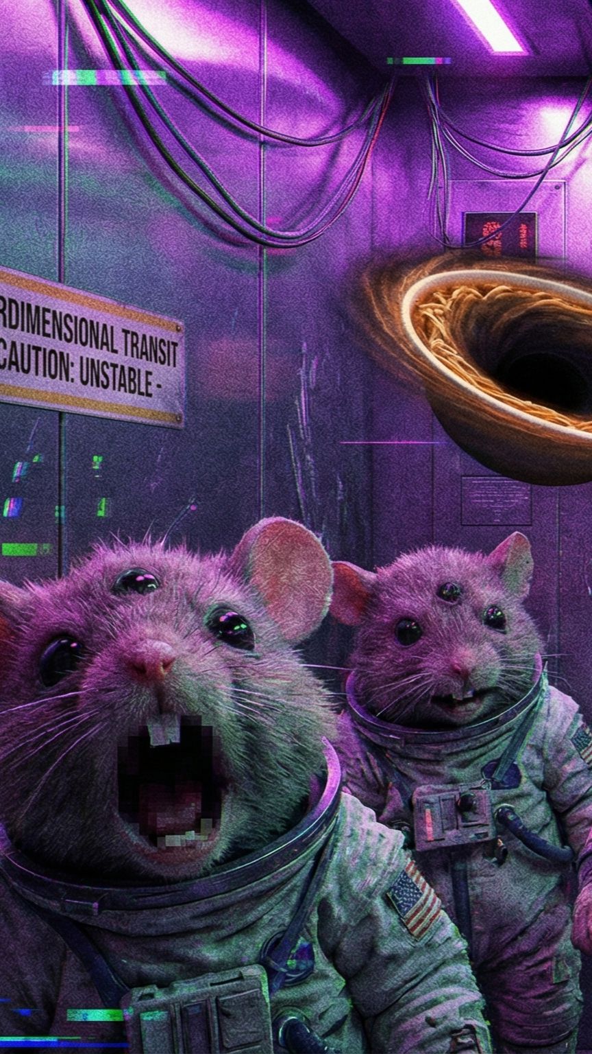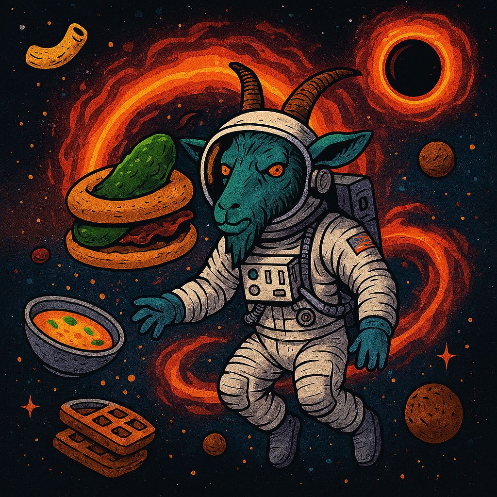 Use the uploaded drum track as the rhythmic base, Make guitars groove with the kick drum using heavy palm-muted chugs on low-tuned 8-string guitars, Add sliding dissonant chords and syncopated riffs to match the drum accents, Bass follows guitars for depth and punch, Include ambient synth layers and reverb-heavy textures between breakdowns for sci-fi atmosphere, Vocals: surreal sci-fi nonsense lyrics delivered with a mix of growls, screams, and spoken chants, Style: djent with atmospheric elements, Tesseract-inspired, blending brutality with spacious soundscapes and cosmic absurdity