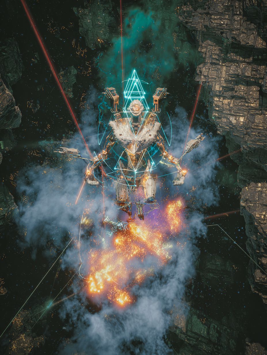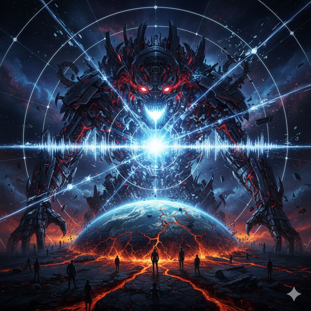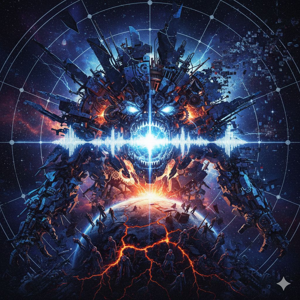 Extreme Djent Deathcore, Technical Death Metal, Polyrhythmic Brutality, Ultra-modern surgical production, Pulsar-like rhythms, Odd time signatures (7/8, 9/8, 13/16), 8-string guitars with razor-sharp palm-muted chugs locked to kick drums, Dissonant tritones and minor seconds, Deep guttural growls (80-150 Hz) layered with abrasive high screams (400-800 Hz), Mid-tempo verses (150 BPM), Catastrophic breakdowns (70 BPM), Technical dissonant bridge with constantly shifting meters, Industrial noise elements, Subsonic bass drops, Dark ambient cosmic soundscapes, Pitch-shifted demonic effects on breakdowns, Gang vocals on choruses, Robotic distortion, Clinical spoken-word passages in outro